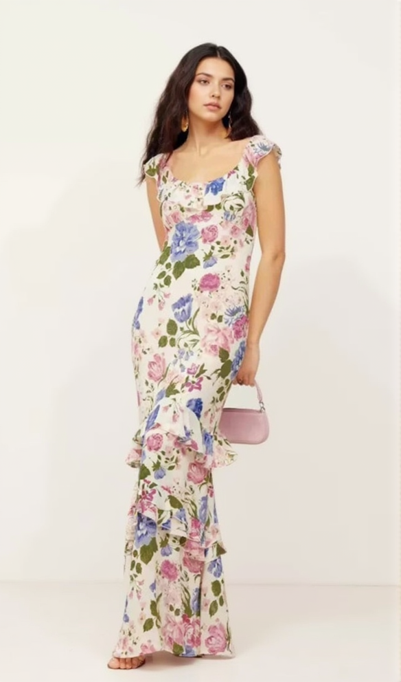 PRISCILLA MULTICOLOR OFF SHOULDER PRINT LAYERED MAXI DRESS