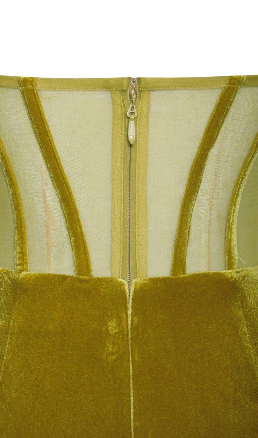 • Material: Made with a combination of stretch velvet, stretch mesh, and a boned corset, the Priya Gold Draping Corset High Slit Velvet Gown offers a comfortable and flattering fit.