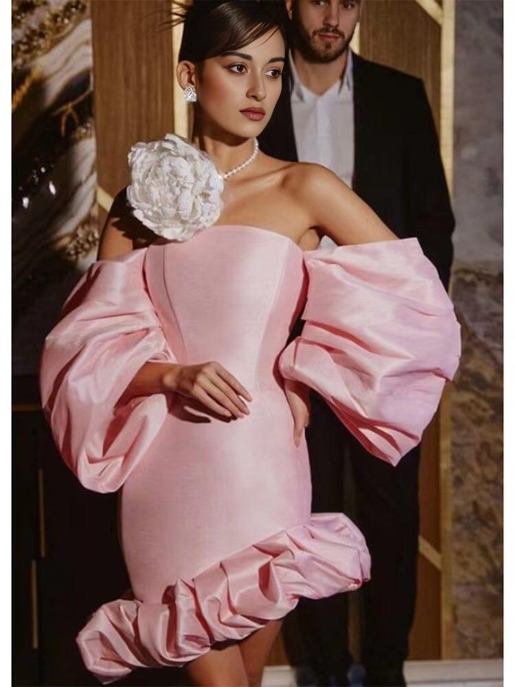 Elevate your style with this stunning Puff Asymmetric Mini Dress in Pink. Designed to make a statement, this dress features a one-shoulder puff sleeve and an angled asymmetrical ruffle hem, adding playful movement and dimension to your look.