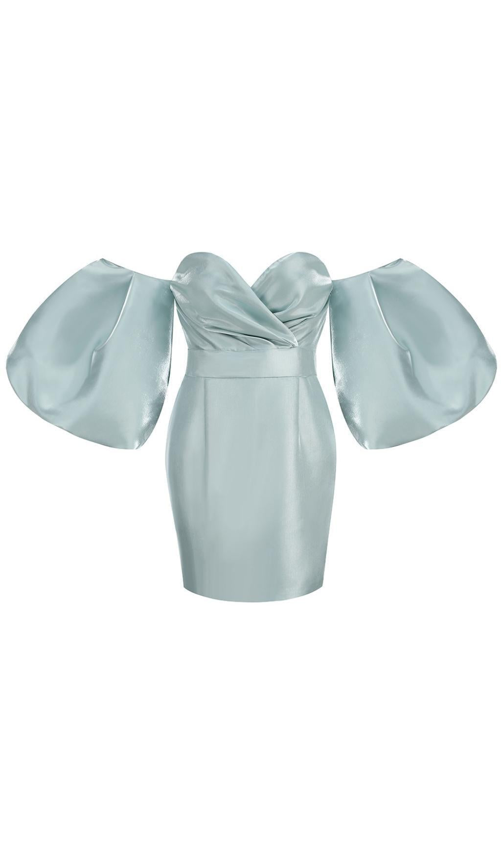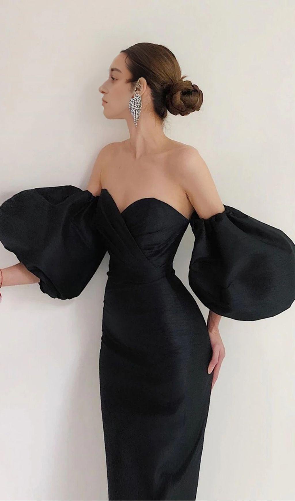 Romantic yet dramatic, our Puff Sleeve Dress in Black is the perfect addition to your wardrobe. Made from a luxurious heavyweight duchess satin, this dress is designed to create a liquid hourglass shape. The clever paneling and oversized ruffles on the shoulders add a touch of drama, while the off-shoulder cut adds a sexy twist.