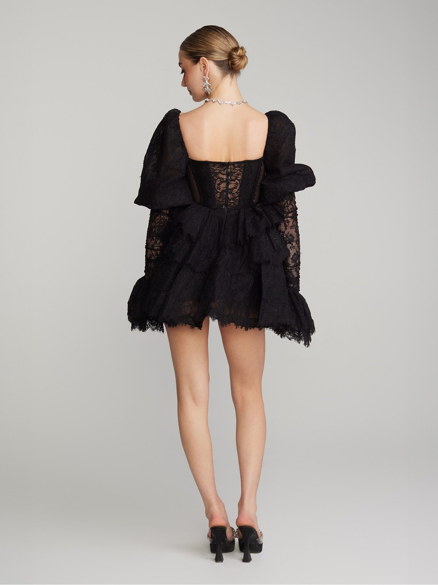 PUFF SLEEVE LACE MINI DRESS IN BLACK