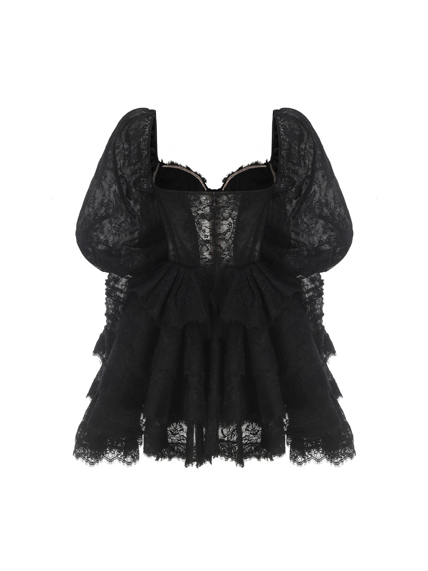 With intricate lace detailing and playful puff sleeves, this dress exudes adventure and confidence. Perfect for the risk-taker who wants to make a statement. Unleash your inner daring with this little black dress.