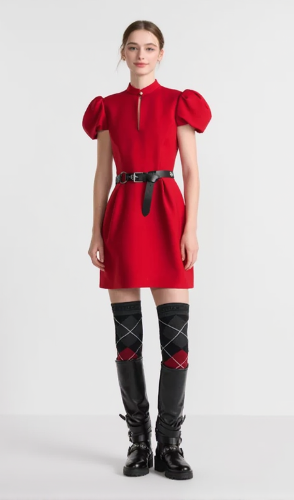 puff sleeve pleated mini dress in red (without black belt)