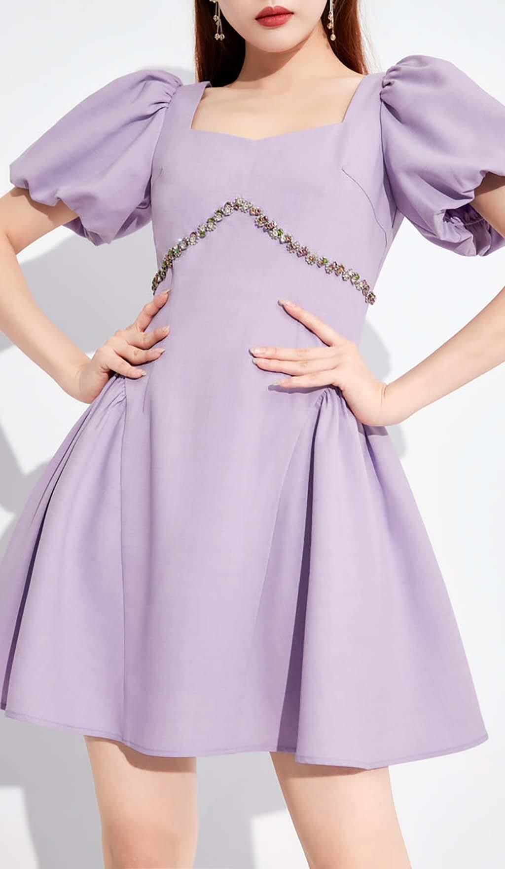 PUFF SLEEVES WAIST-TIGHTENING MINI DRESS IN LILAC