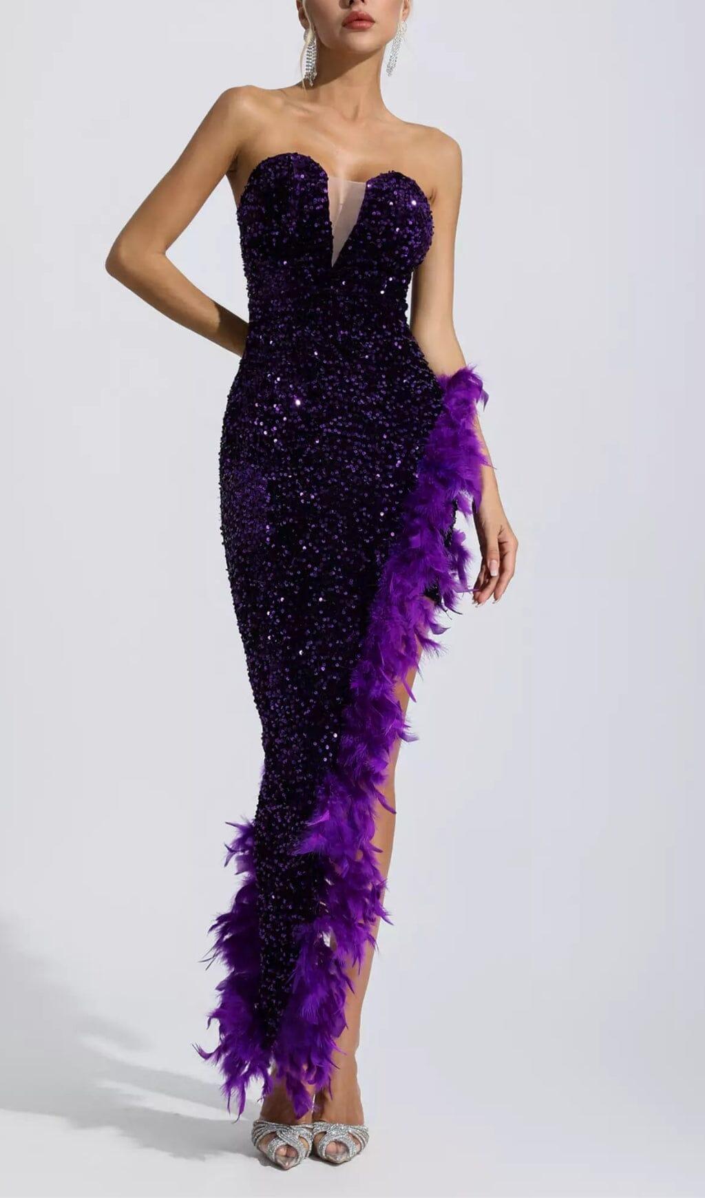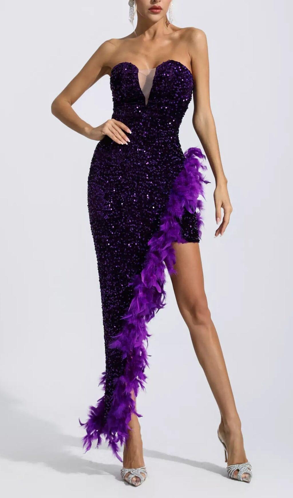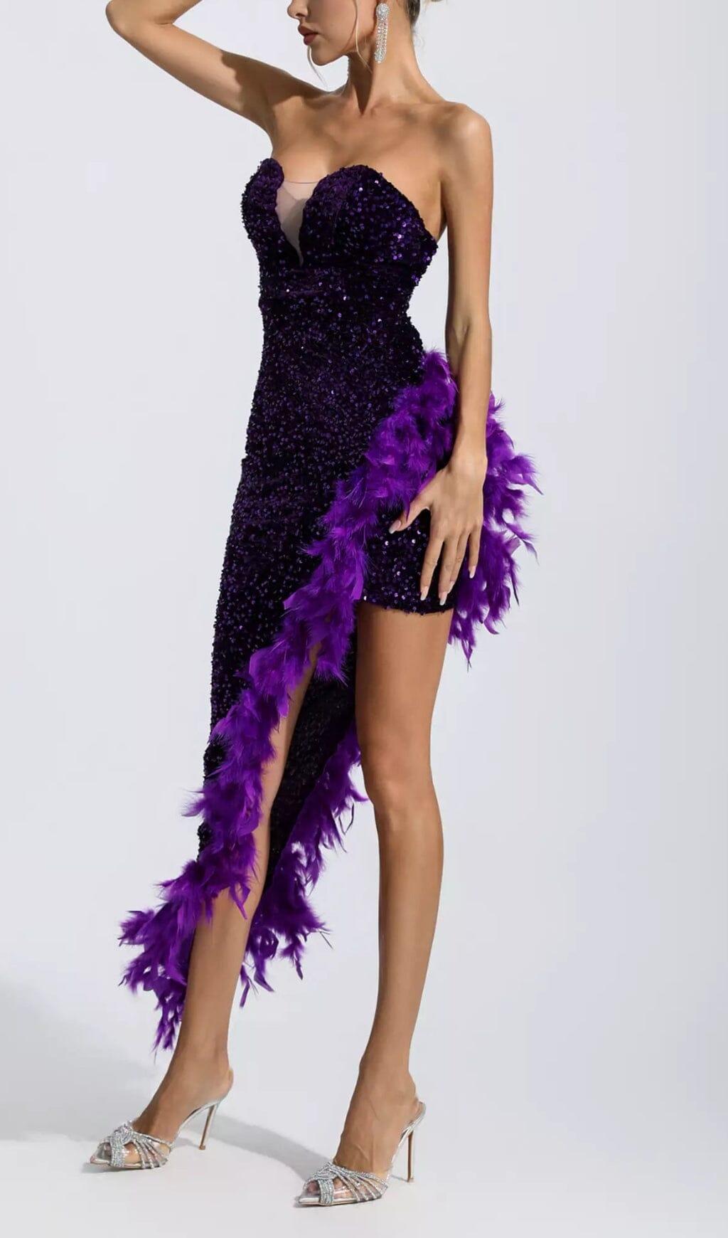 PURPLE SEQUIN FEATHER DRESS