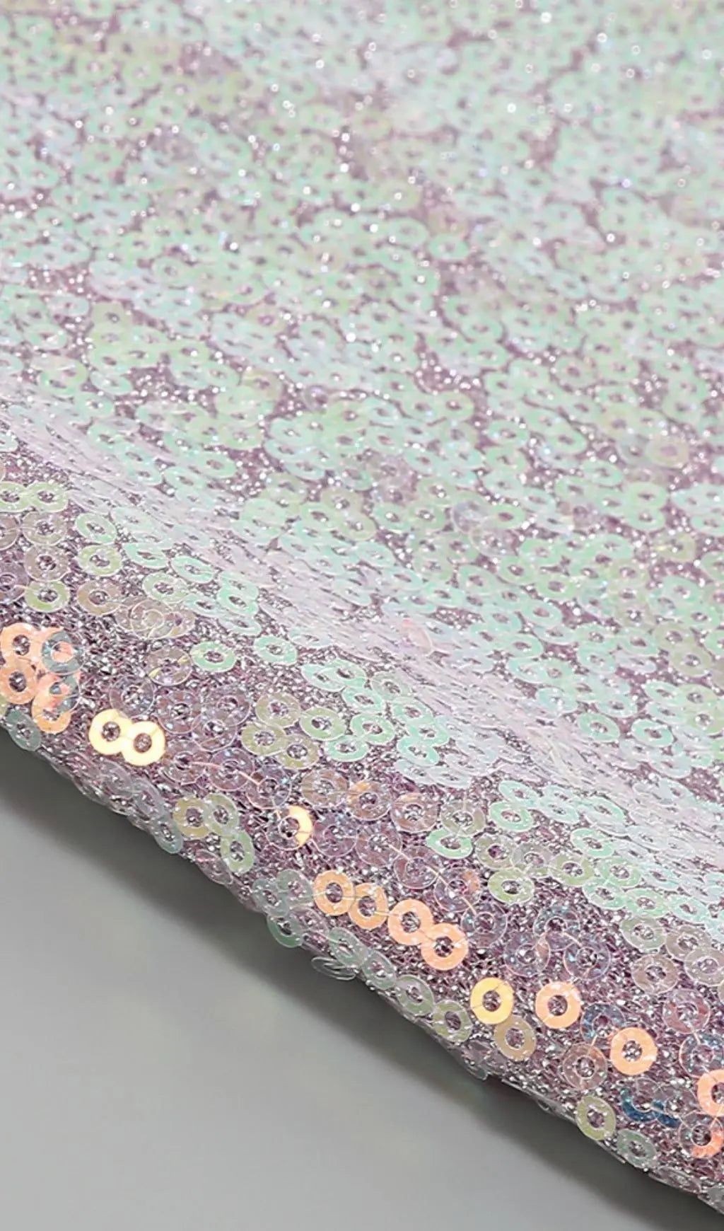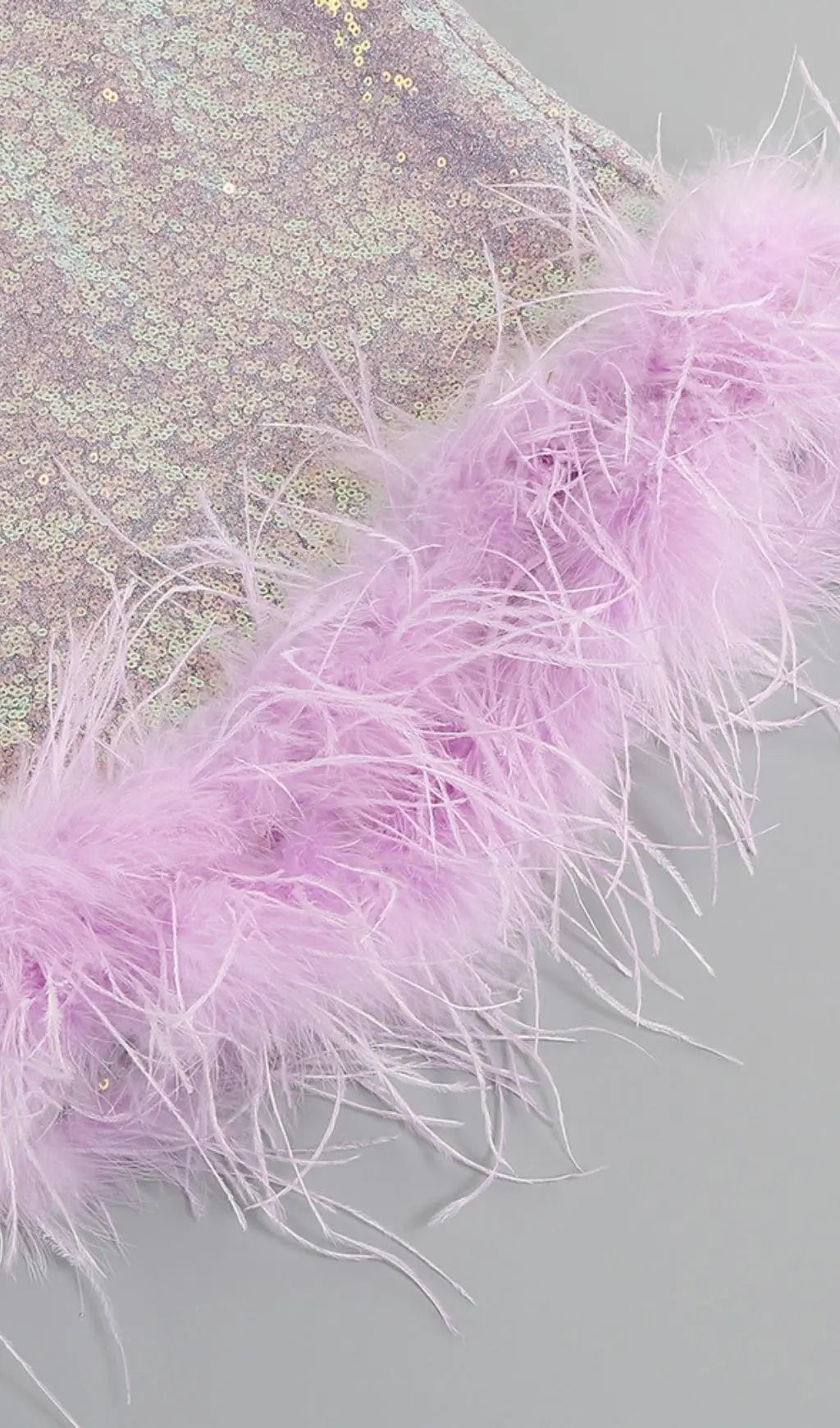 PURPLE STRAPLESS SEQUIN FEATHER MIDI DRESS
