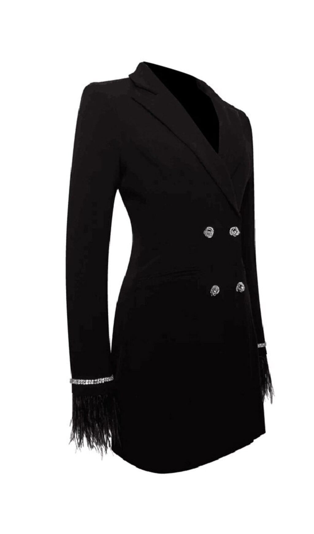 QUILLA BLACK FEATHER CRYSTAL SLEEVE BACKLESS BLAZER DRESS