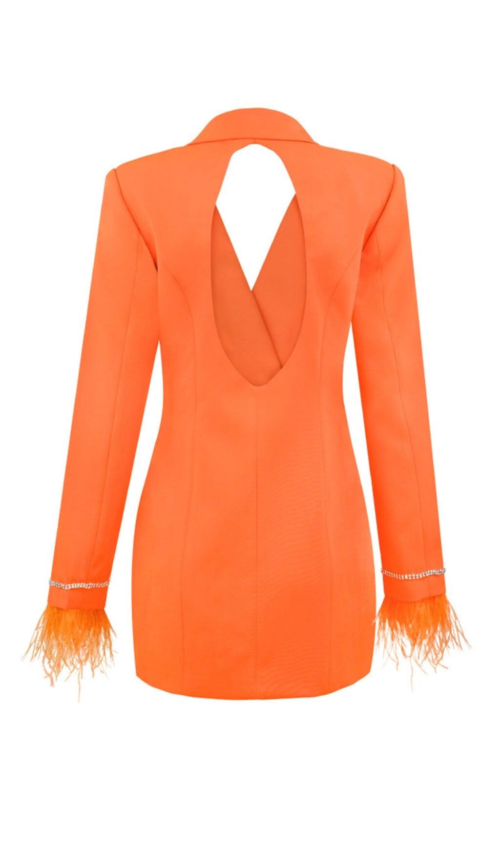 Introducing the Quilla Orange Feather Crystal Sleeve Backless Blazer Dress