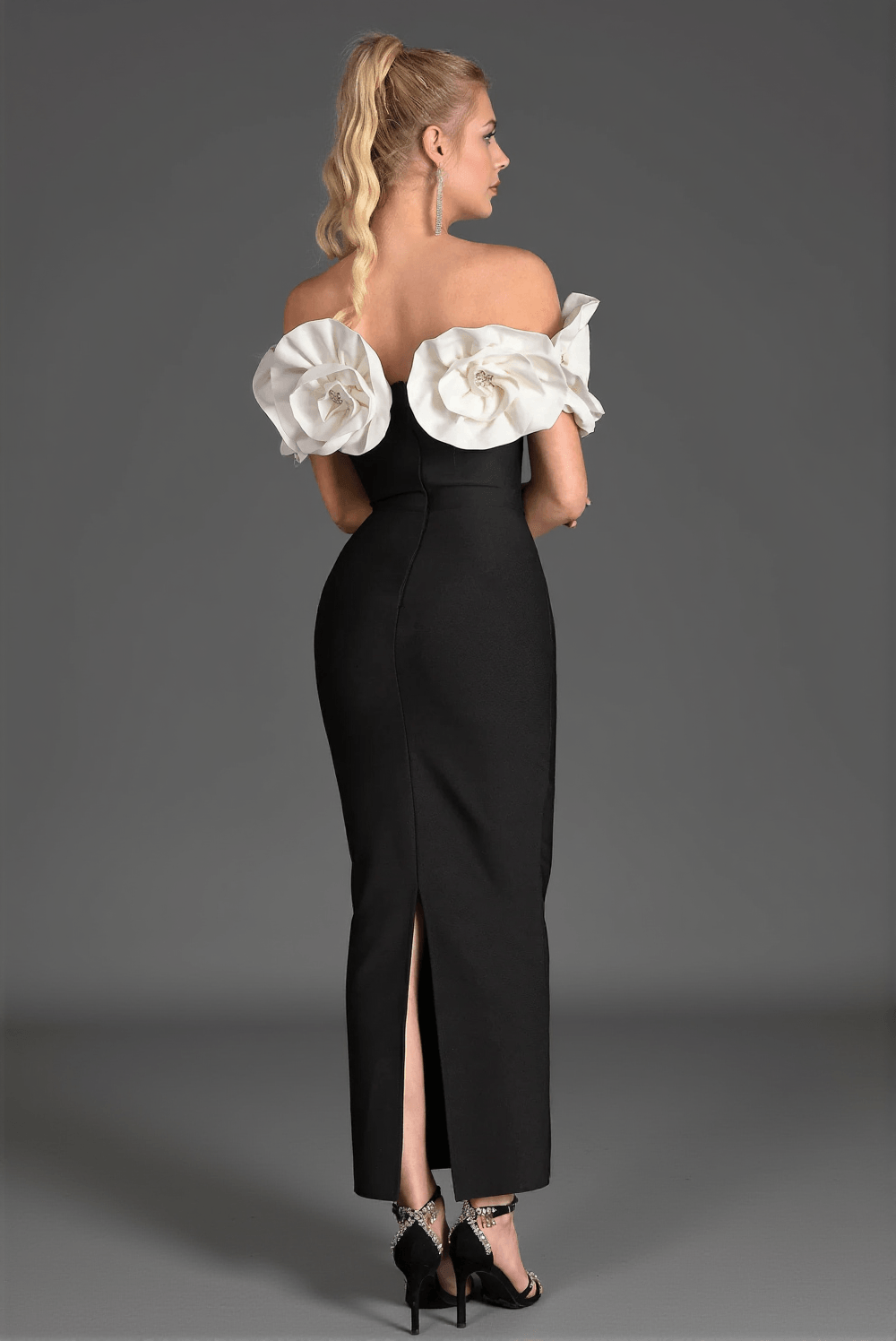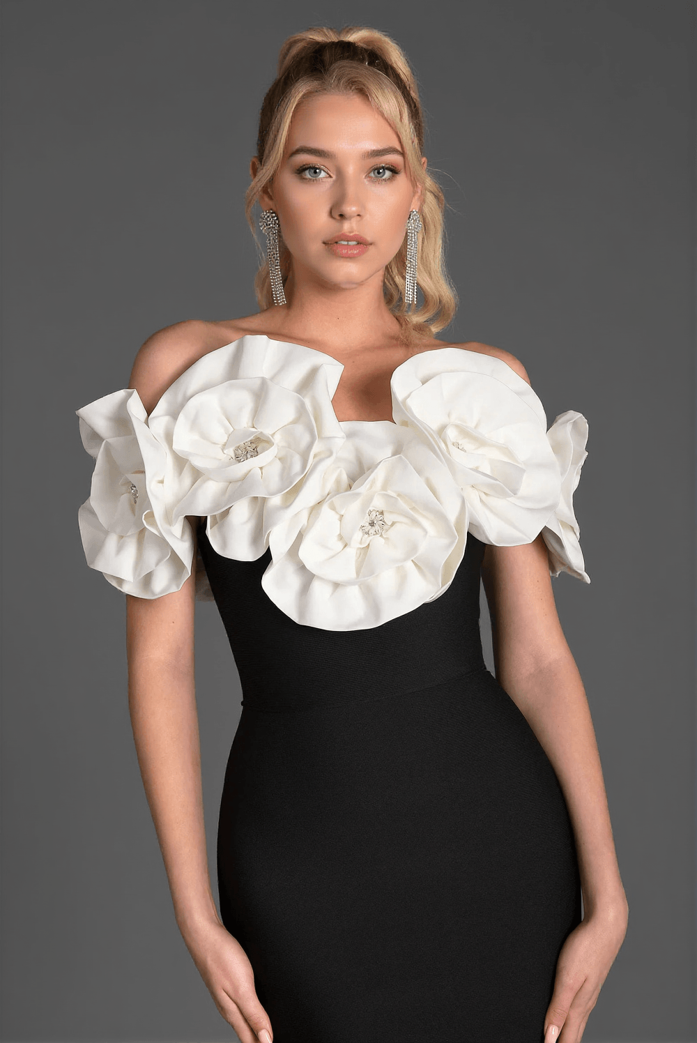 Elevate your fashion game with the Rafail 3D Flower Bandage Dress, a stunning garment that combines elegance and modern craftsmanship. Featuring an exquisite off-shoulder neckline and intricately detailed 3D floral embellishments, this dress is designed to make any special occasion truly unforgettable.