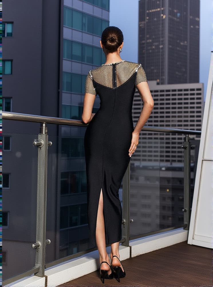 Experience luxury in every detail with the Rainey Crystal Mesh Bandage Midi Dress. Crafted with intricate crystalline detailing, this mid-length design flatters the figure with its form-fitting silhouette. With a subtle hint of sparkle, this dress exudes sophistication and elegance.