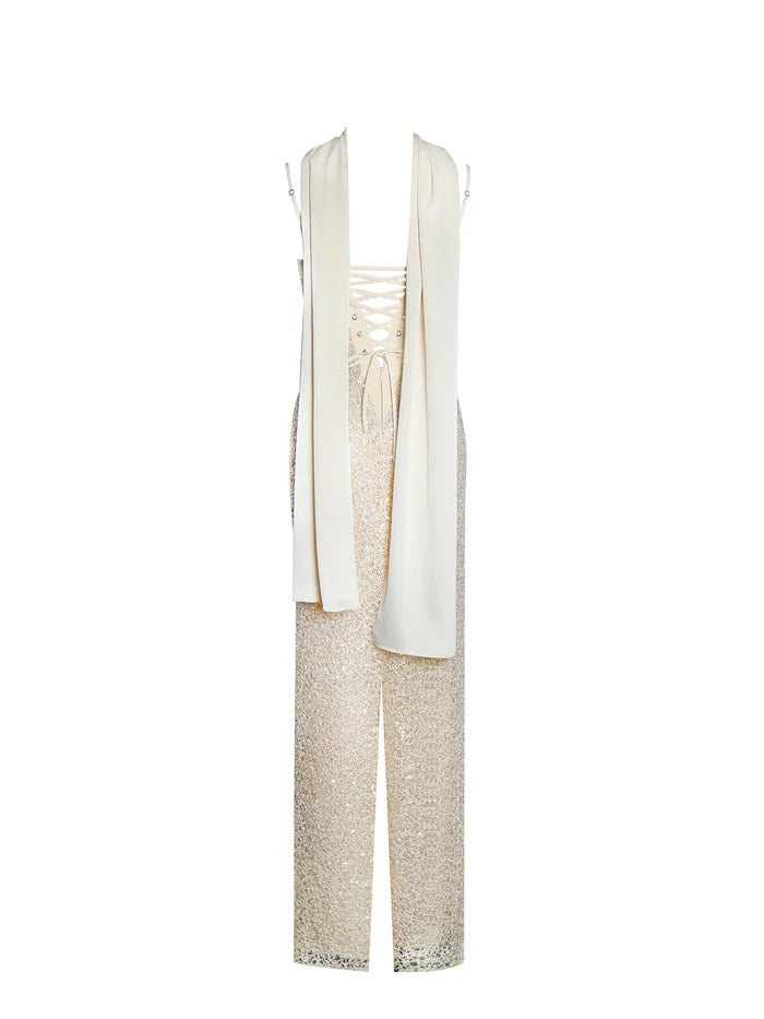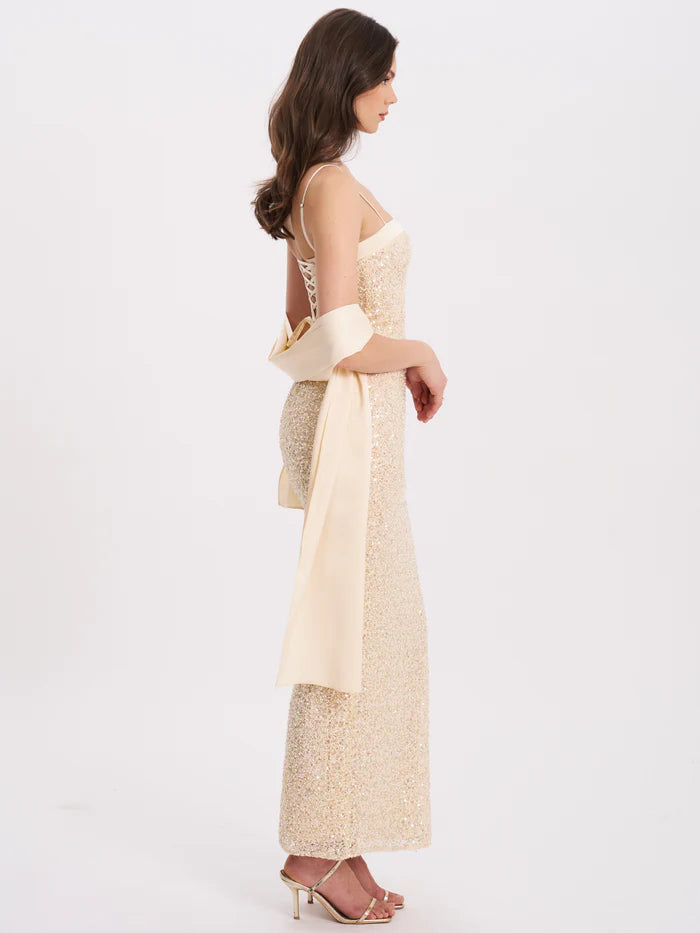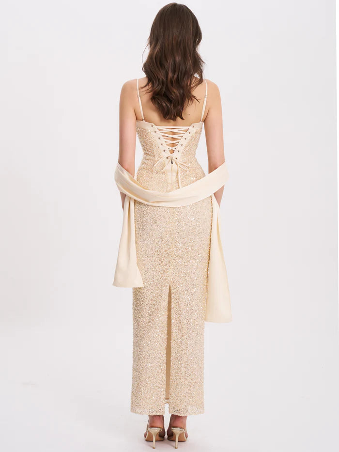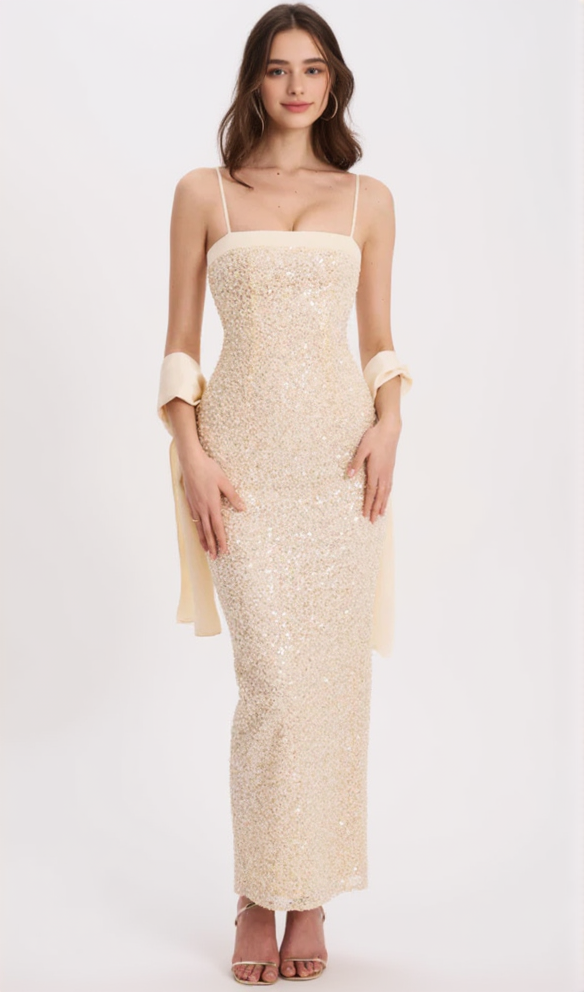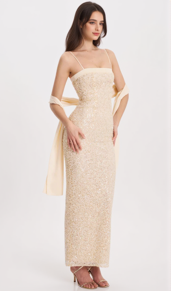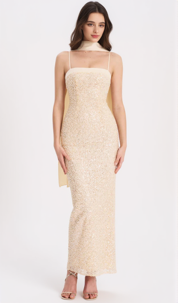 Raizel Gold Beaded Sequin Bodycon Gown with Scarf MAXI DRESS
