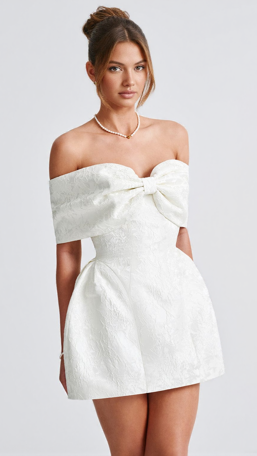 A stylish but oh-so-romantic design, Raquel is a showstopper for your big day. Cut from beautiful floral jacquard fabric, it features an off-the-shoulder bardot bow neckline to flatter the décolletage. The mini dress is complete with a tulip shaped skirt and lace up back for your perfect fit. Style with flower-adorned heels and pretty waved hair.