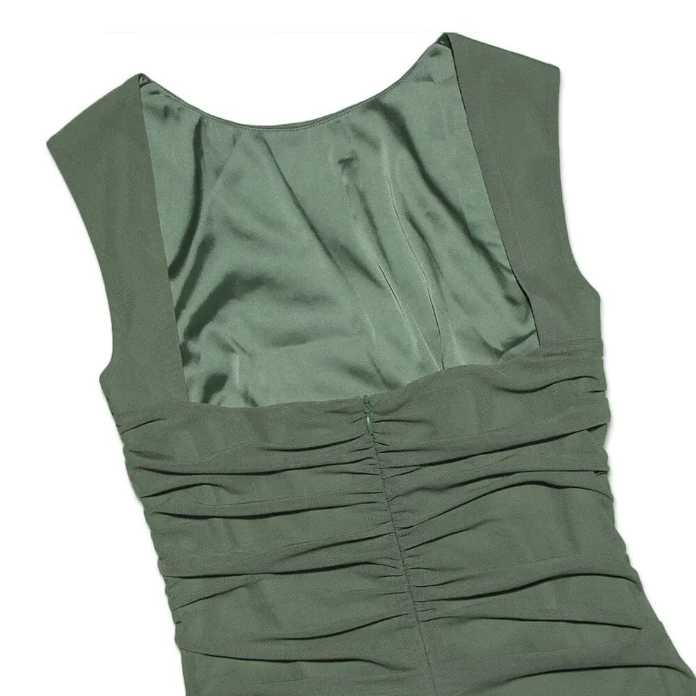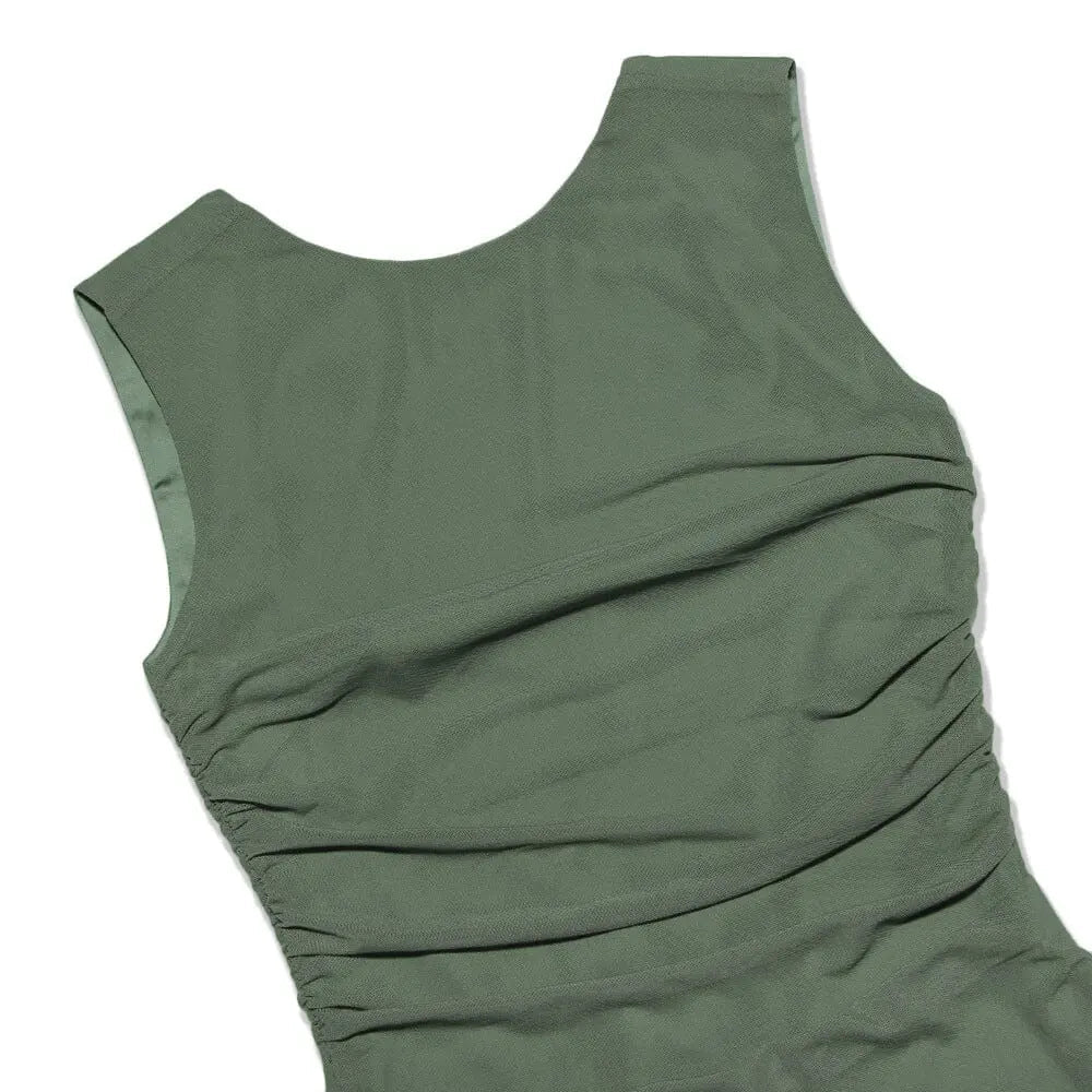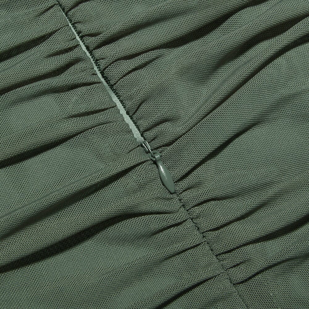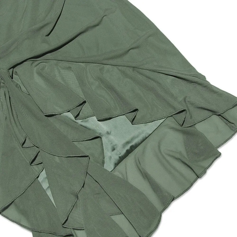Our Ruched Irregular Dress in Green is a must-have for any daring fashionista. The corset-inspired waist and irregular hemline add an edgy twist to this sophisticated piece, making it perfect for any occasion.