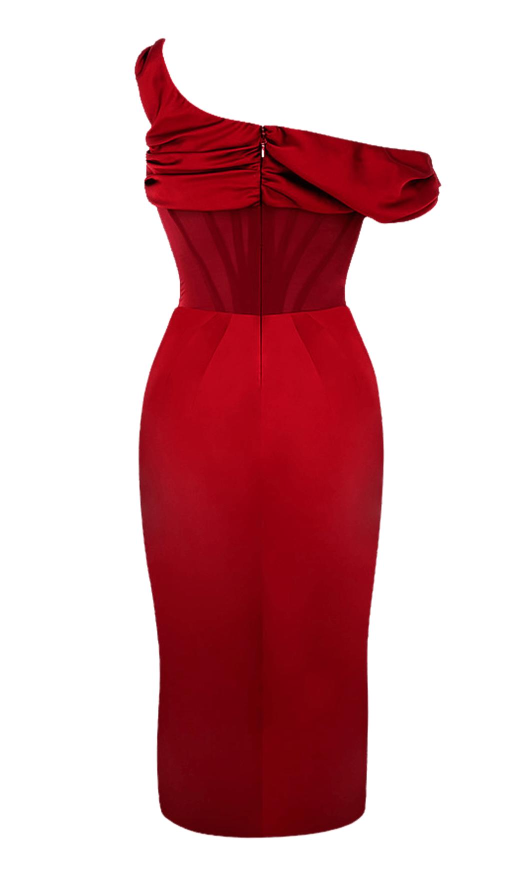 ASYMMETRIC DRAPE MIDI CORSET DRESS IN RED