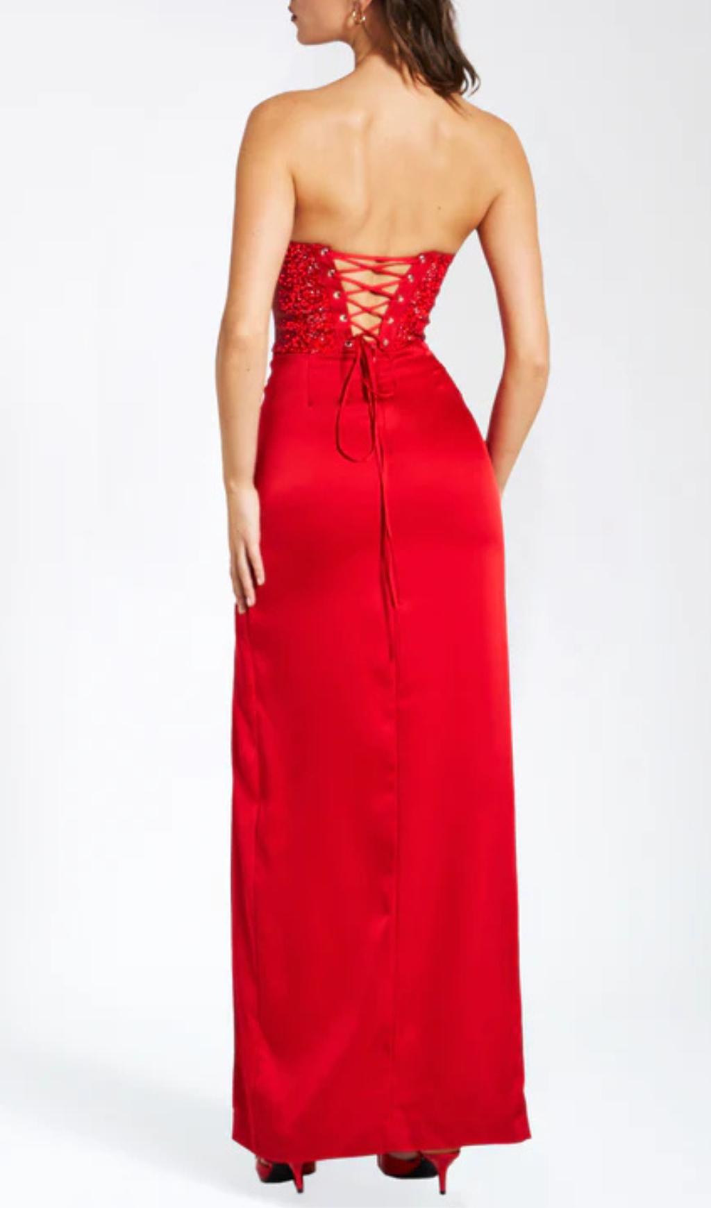 RED CRYSTAL HIGH SLIT SATIN CORSET GOWN
