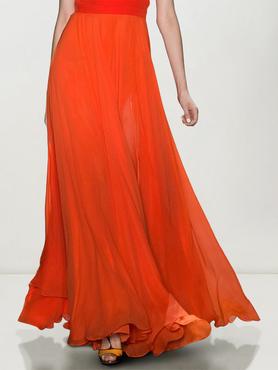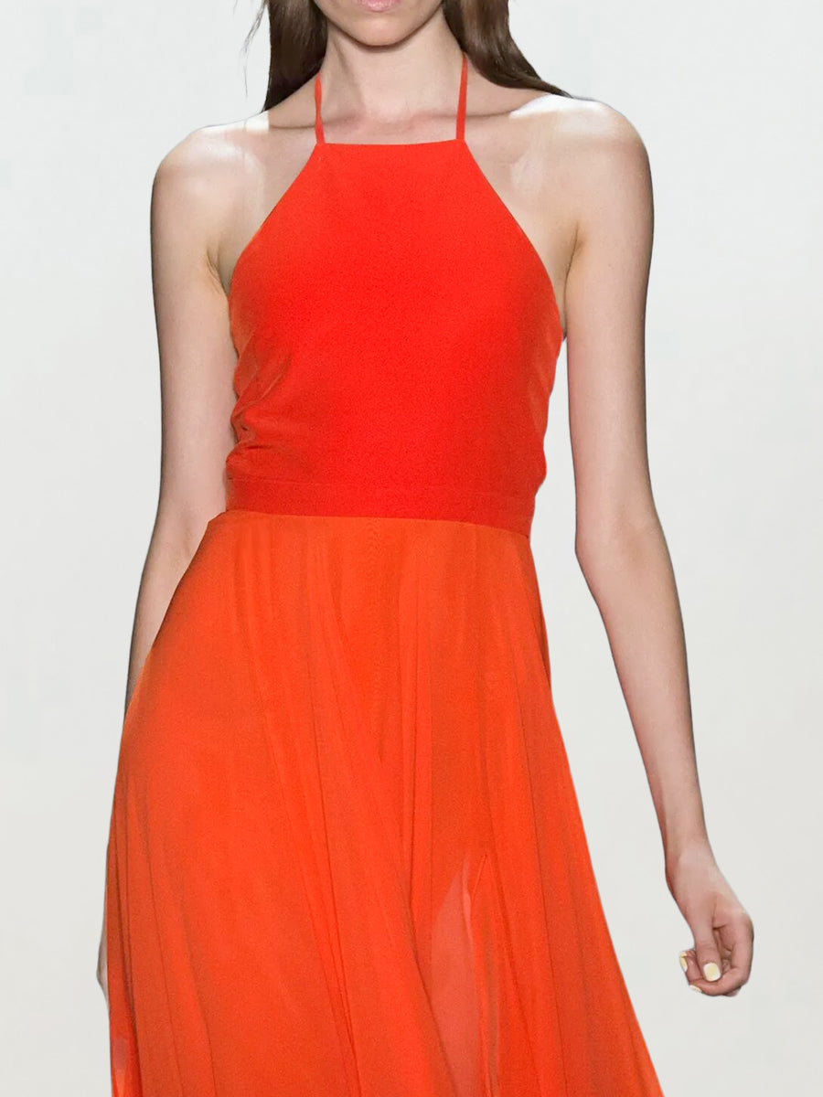 This dress features a vibrant red hue, a halter neckline, and a flowing chiffon maxi skirt. The sleek bodice and airy skirt create an elegant silhouette, perfect for ��holiday break dress to impress�� moments or a ��celebrity event dress to impress��. Its bold color and classic design let you ��dress to impress�� effortlessly, ideal for summer parties, romantic dinners, or special outings where you want to stand out with sophistication.