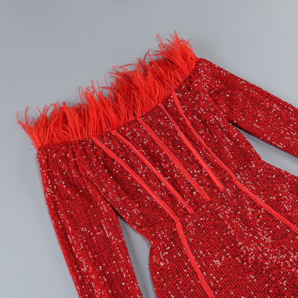 Add a touch of glamour to your wardrobe with our Red Feathers Sequin Dress. Featuring a stunning sequin design and delicate feather detailing, this dress is perfect for any special occasion. With its long sleeves, it's also a great option for colder weather. Feel confident and stylish in this eye-catching dress.