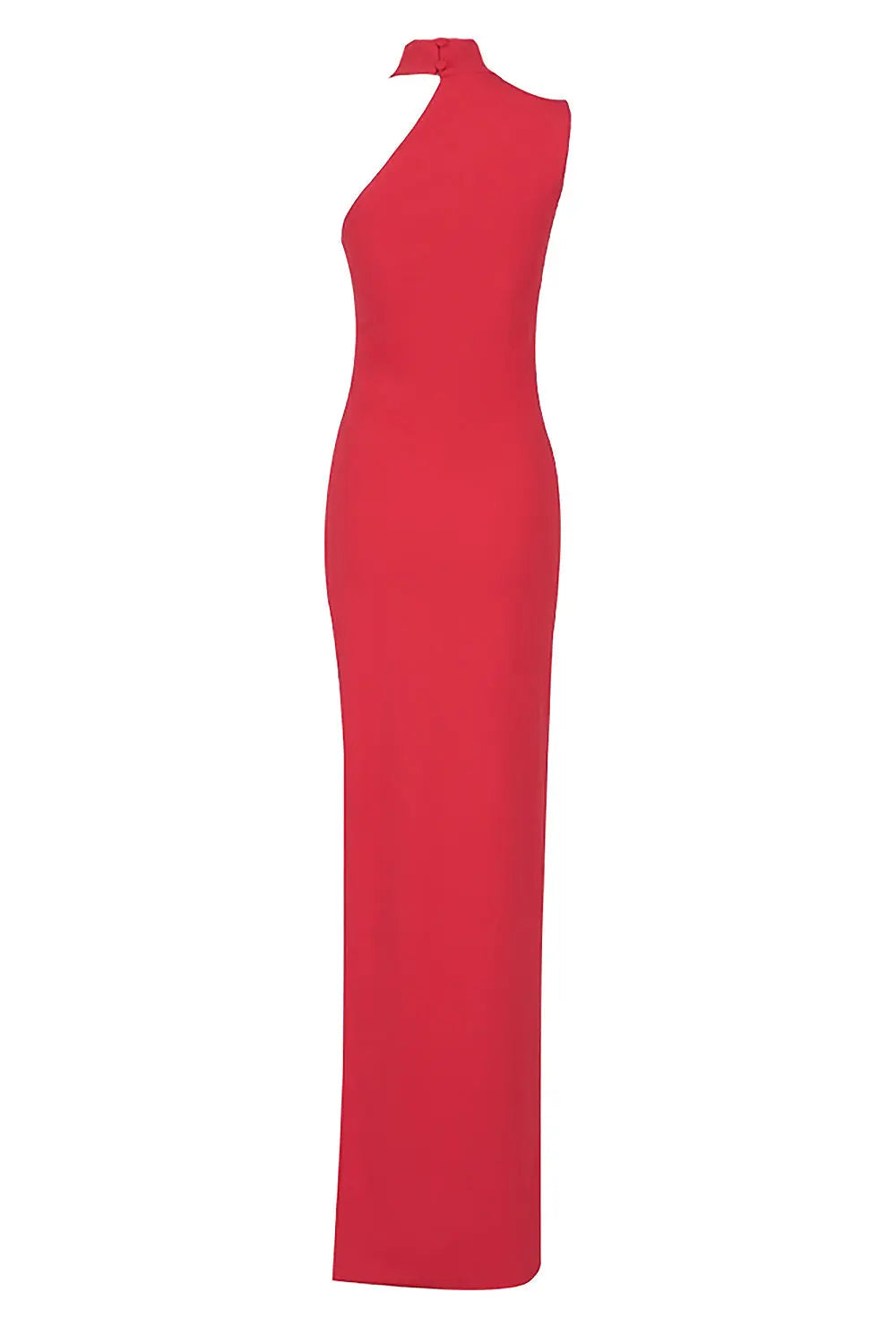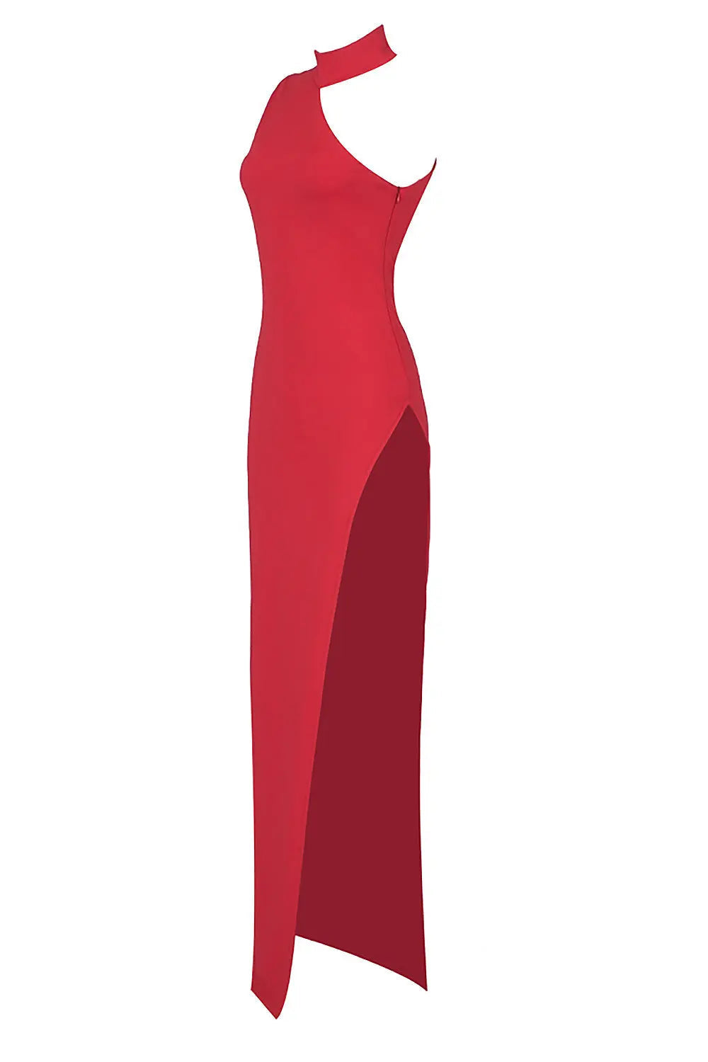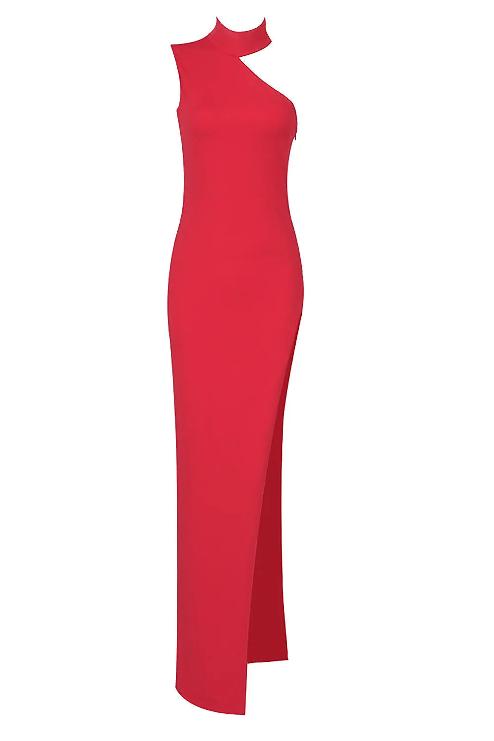 Red O Neck One Shoulder Sleeveless High Split Maxi Dress