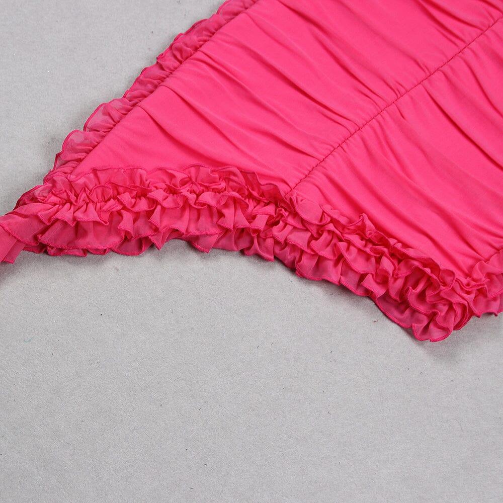 PINK OFF SHOULDER RUFFLE BANDAGE DRESS