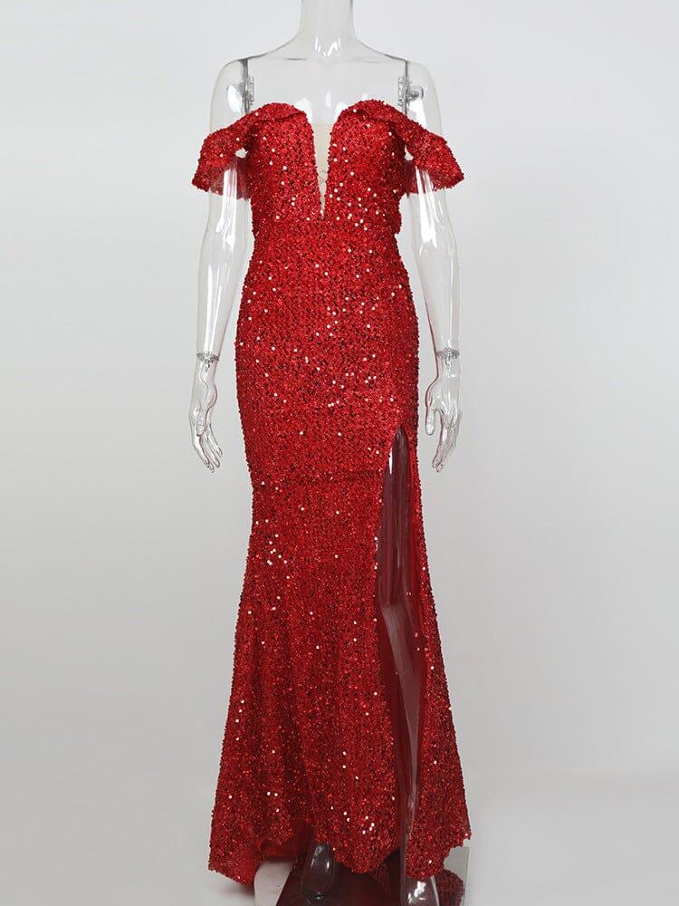 RED OFF-SHOULDER SEQUIN DRESS