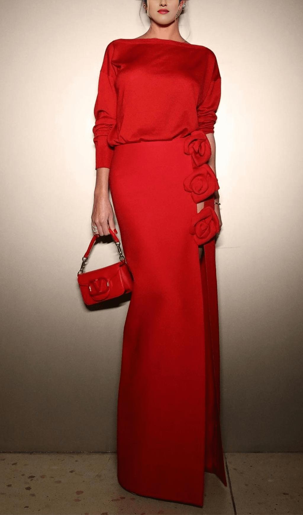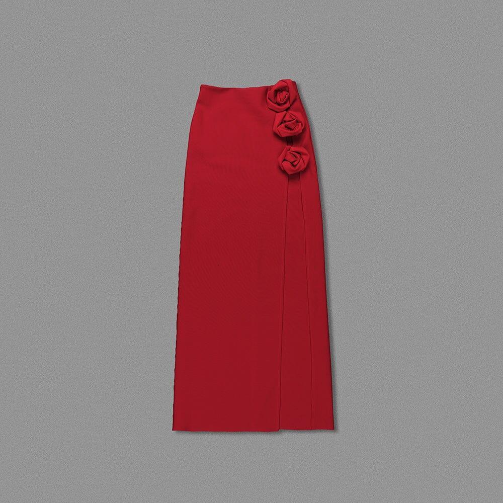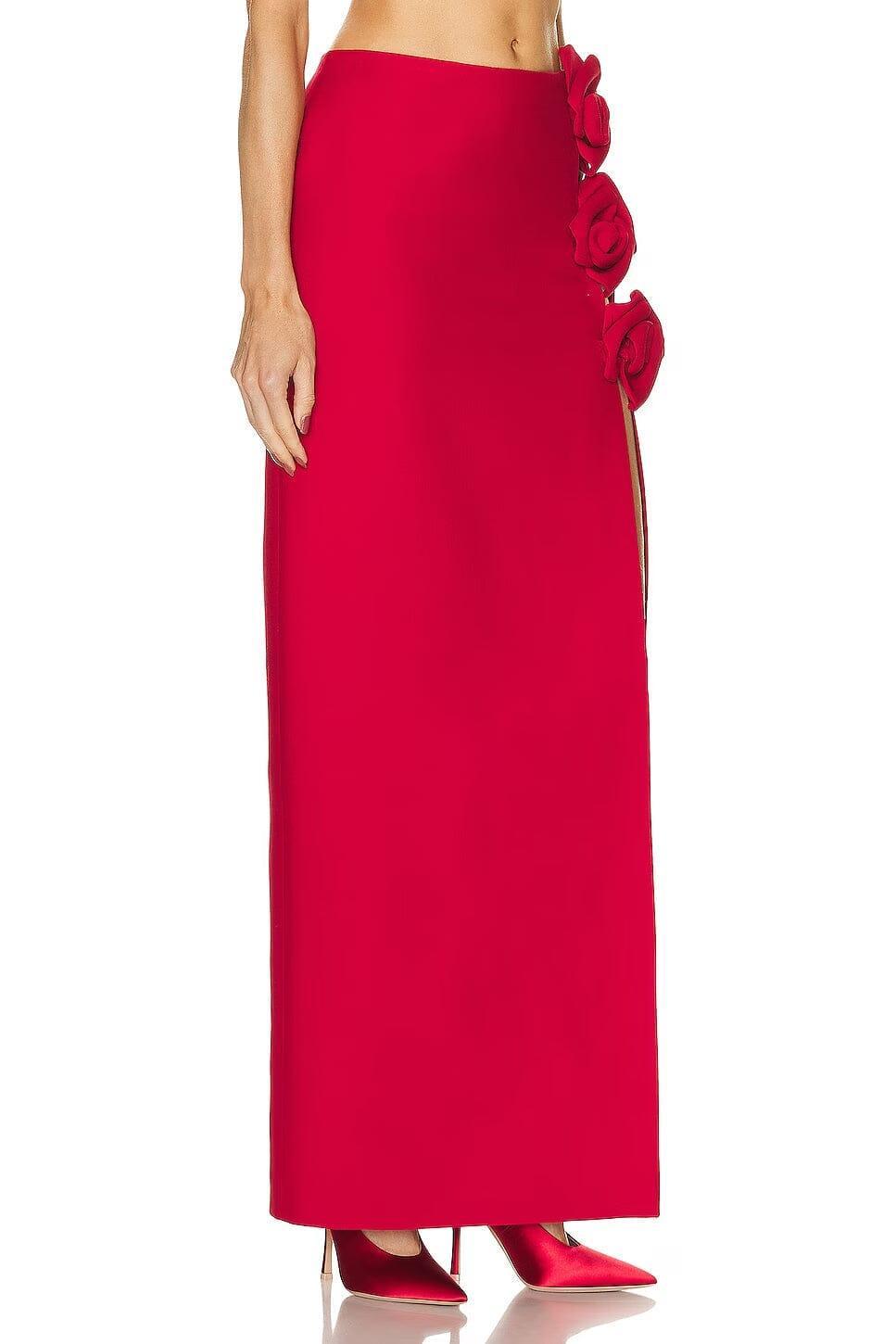 RED WOOL-SILK ROSE-EMBELLISHED SKIRT