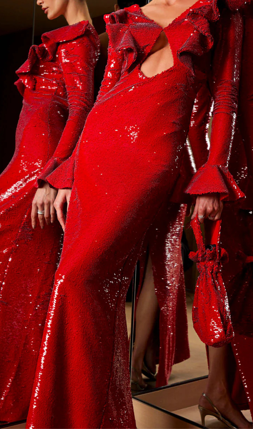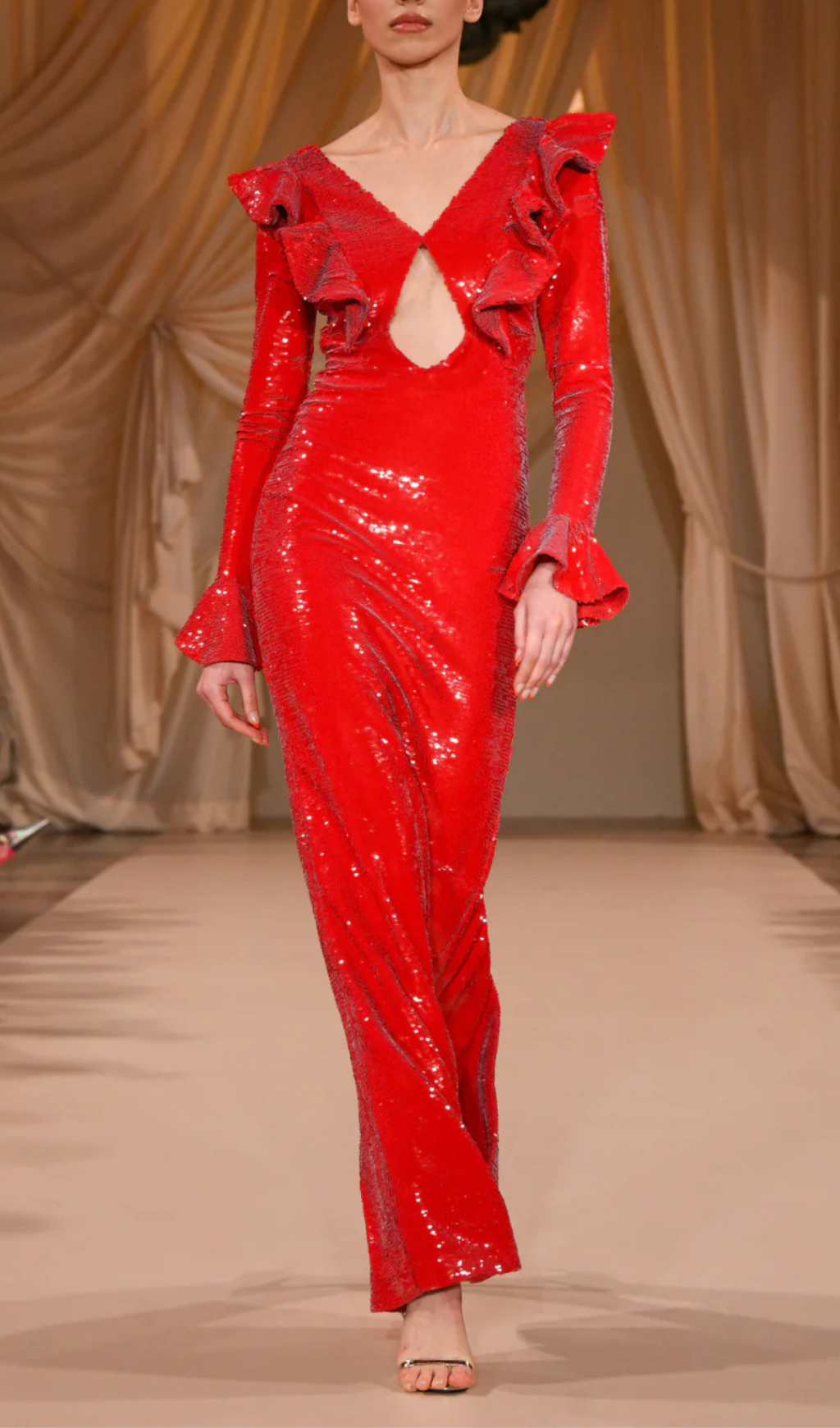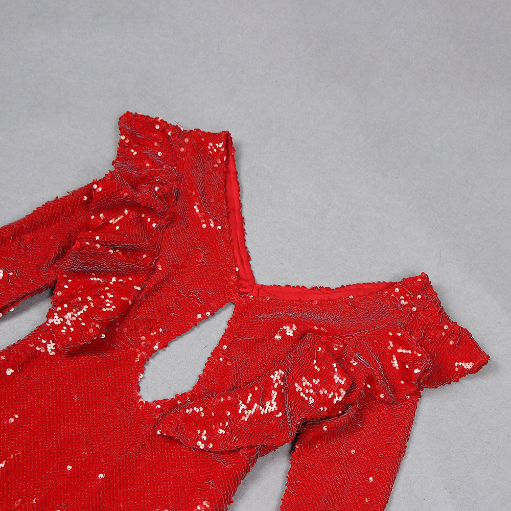 It is made from a sequin fabric and has a concealed back zipper closure and a single back button closure for the top. This maxi dress features a low v-neck, a tear drop cut-out and an open back. The neckline and cuff feature a ruffle detail. The sleeves are fully lines.