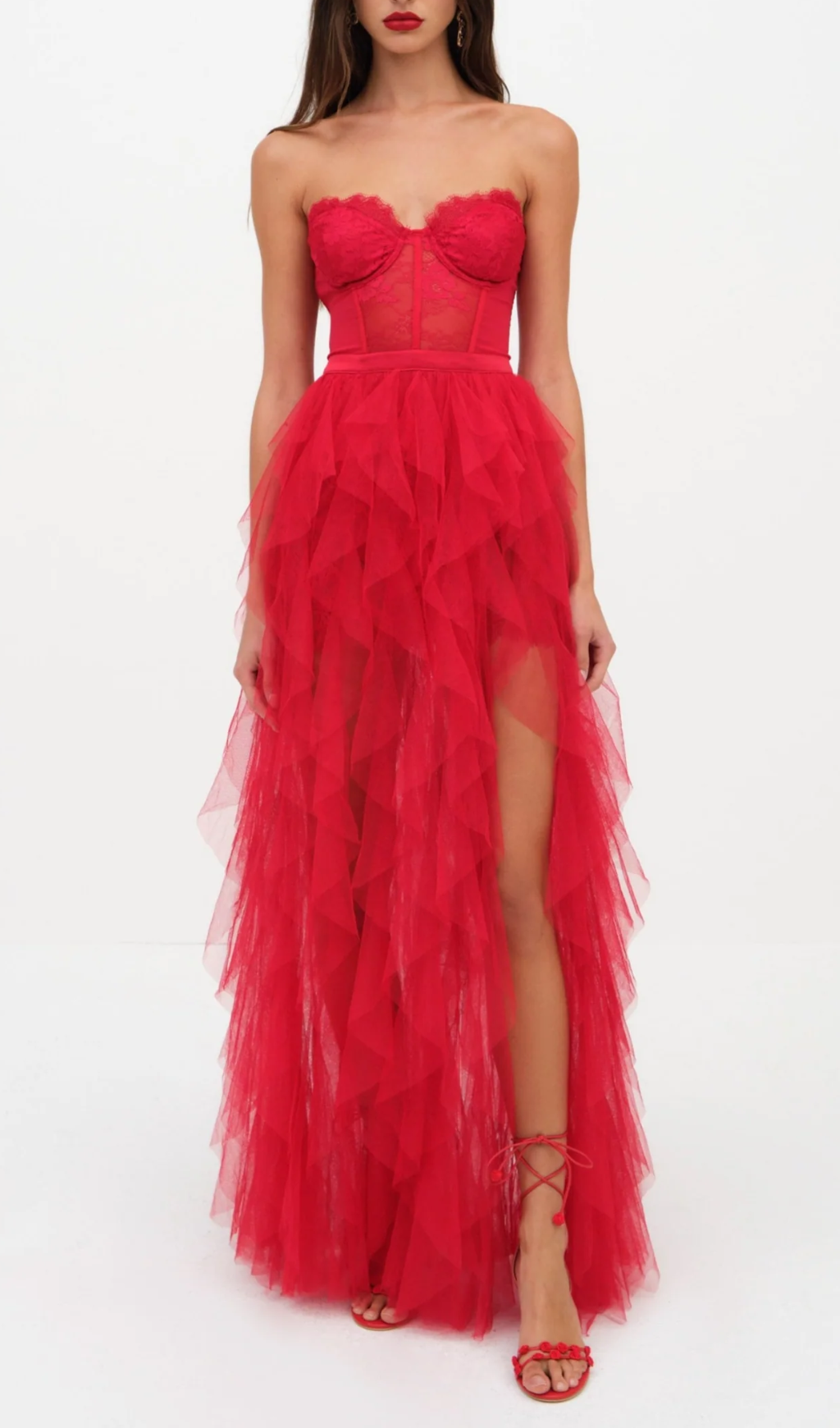 Expertly designed for a flawless fit, our Strapless Lace Patchwork Mesh Bustier Gown exudes effortless elegance. The delicate lace patchwork and mesh accentuate your curves, giving you a stunning silhouette. Perfect for any formal occasion, this gown is a must-have addition to your wardrobe.