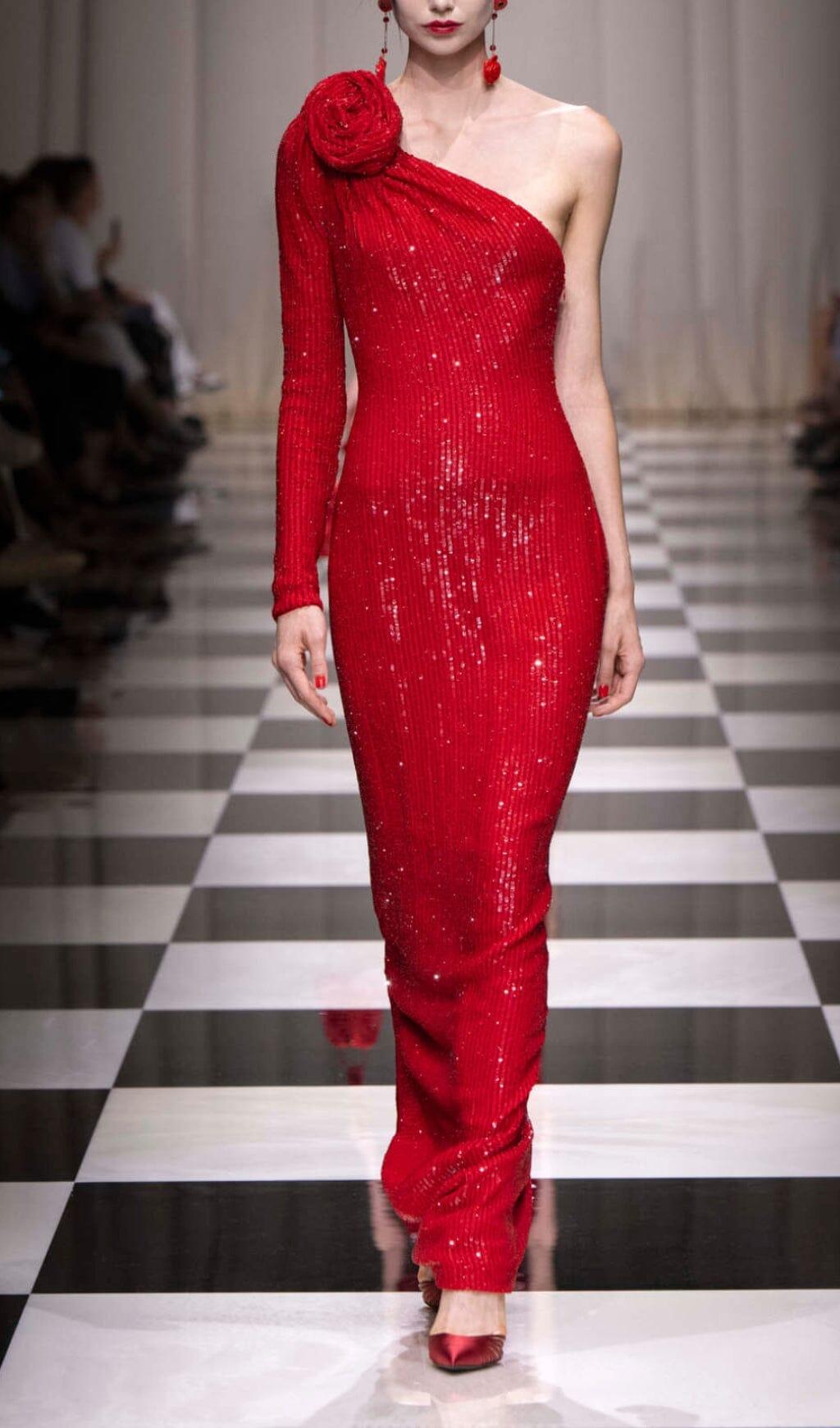 RED THREE-DIMENSIONAL ONE-SHOULDER FLORAL SEQUINED STRETCH DRESS