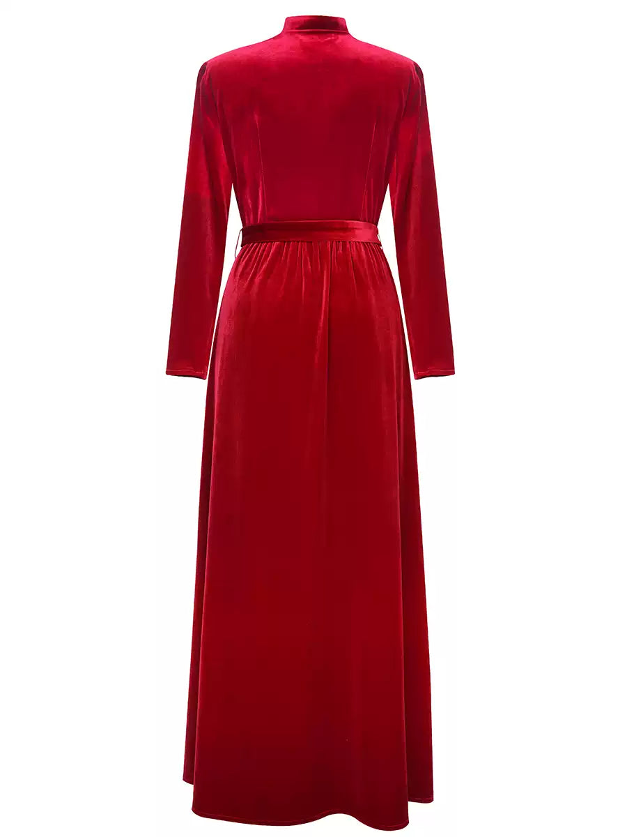 This dress features rich red velvet, a mock neckline, and a waist - cinching belt. Long sleeves and a flowing maxi skirt create an elegant silhouette. Ideal for ��holiday break dress to impress�� gatherings, a ��celebrity event dress to impress��, or a winter soiree. The plush fabric and classic design let you ��dress to impress�� with a touch of luxury, perfect for making a statement at festive occasions or formal events.