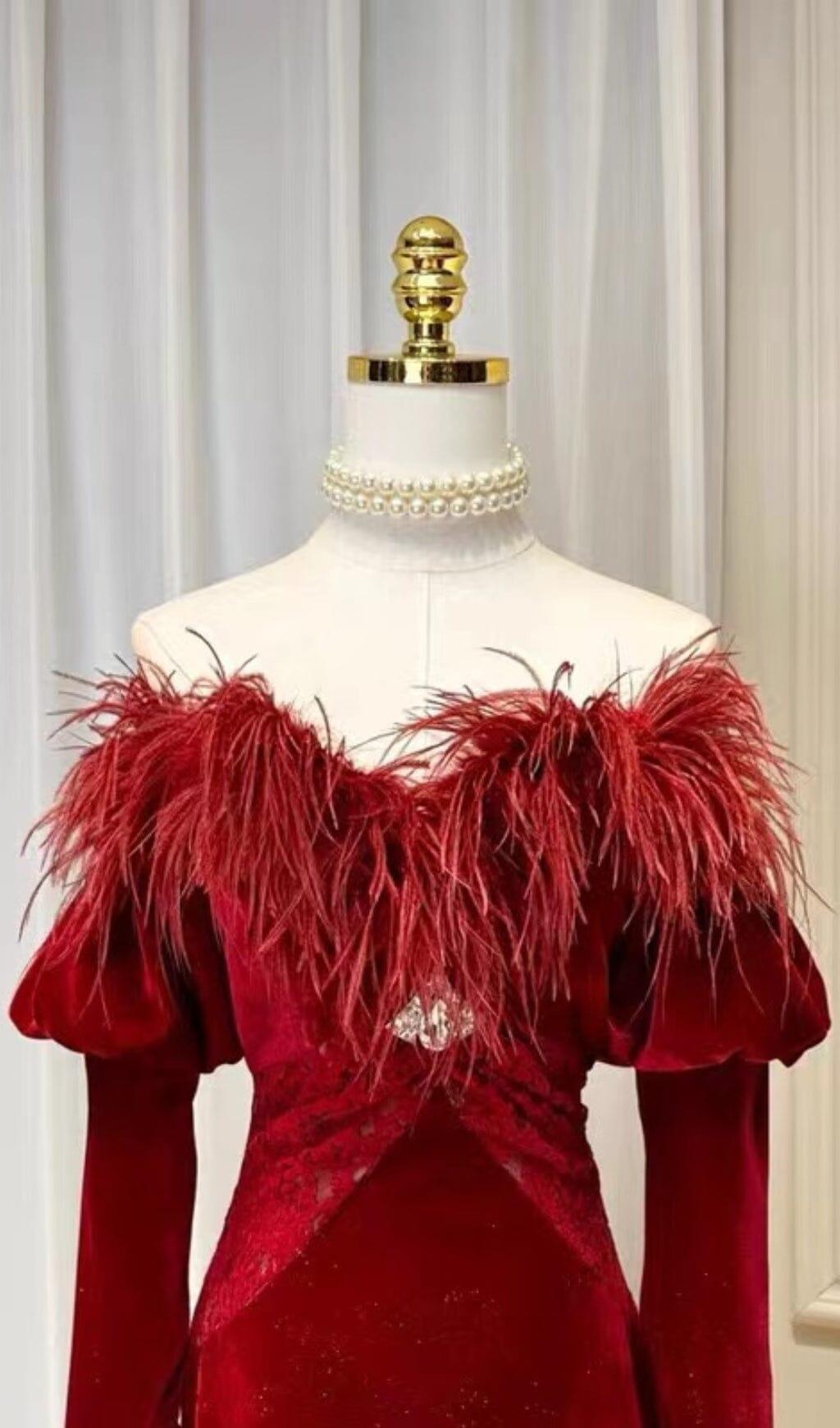 Introducing our Red Velvet Off Shoulder Mini Dress, a winter favorite that will make you feel elegant and stylish. This dress features transparent lace details and puff sleeves, adding a fun and fanciful edge to your look. Whether you're attending a holiday party or a special occasion, this dress is perfect for making a statement.