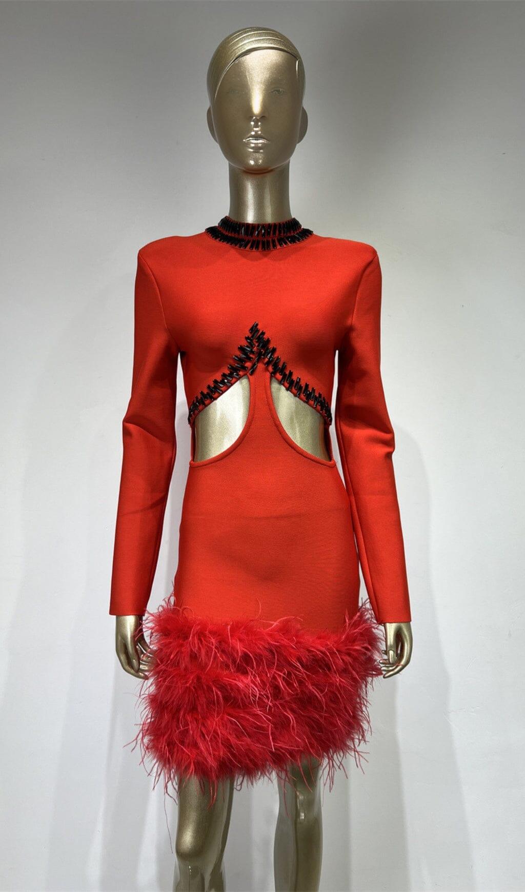 RHINESTONE CUTOUT FEATHER BANDAGE DRESS IN RED