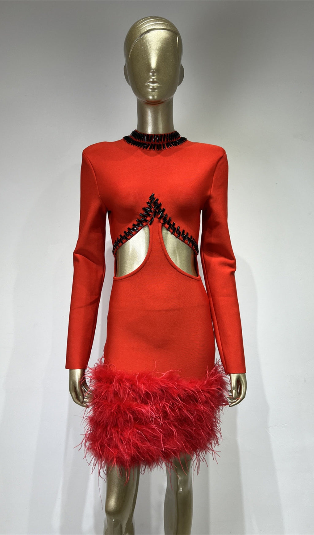 This elegant Rhinestone Cutout Feather Bandage Dress features a stunning rhinestone design, eye-catching cutouts, and luxurious feather accents. Crafted with a figure-hugging bandage material, it flatters and accentuates your curves. Perfect for special occasions, this red dress will make you stand out and feel confident.