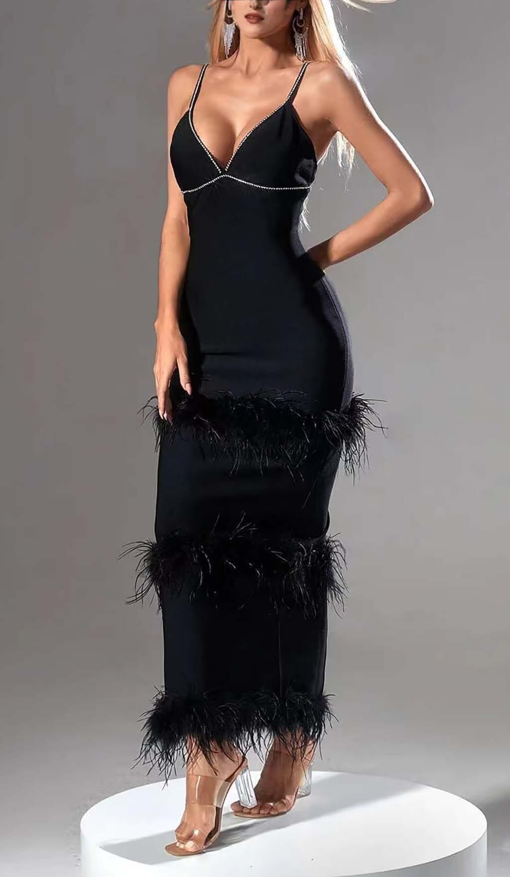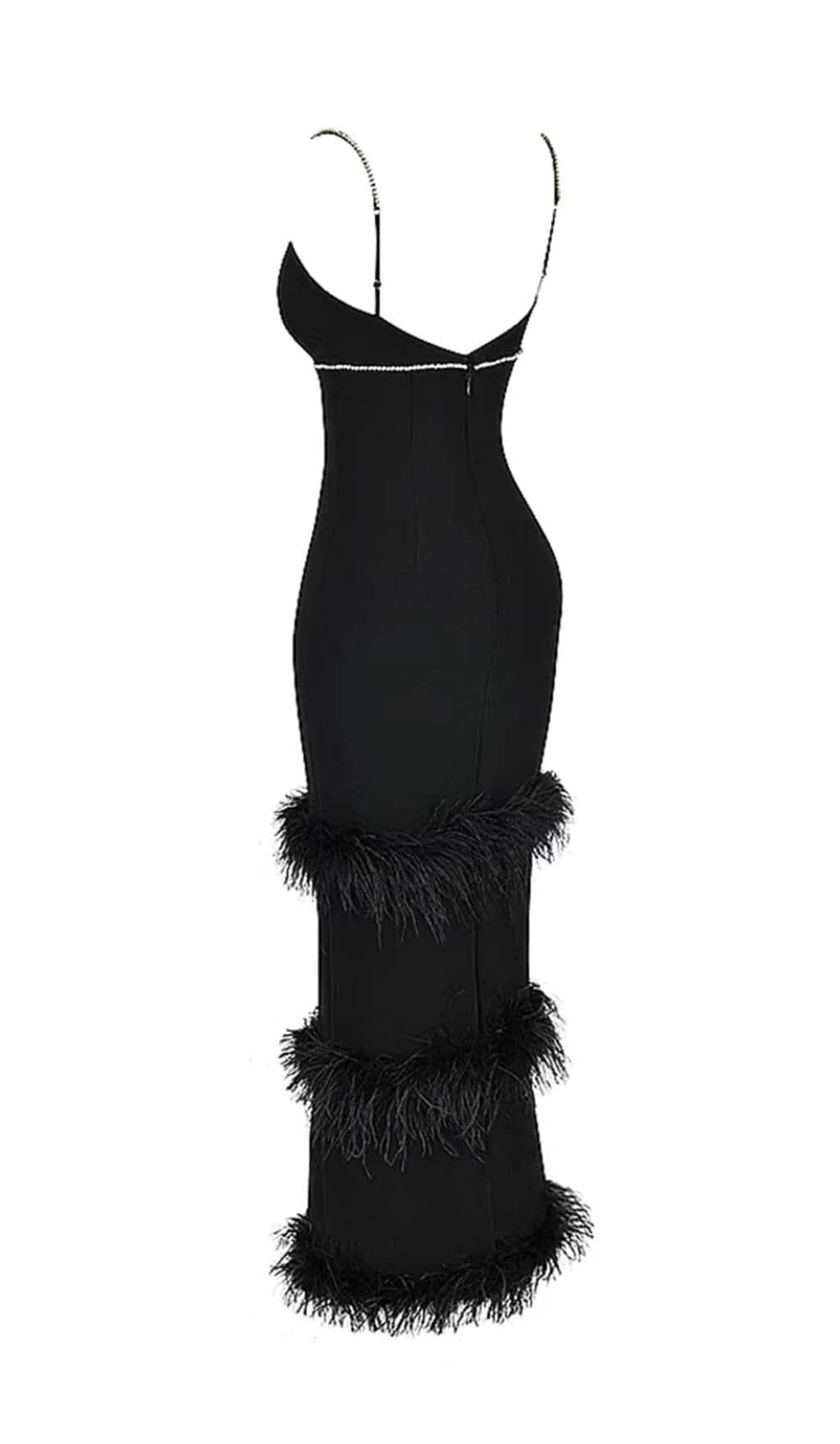 RHINESTONE TIERED FEATHER MIDI DRESS IN BLACK