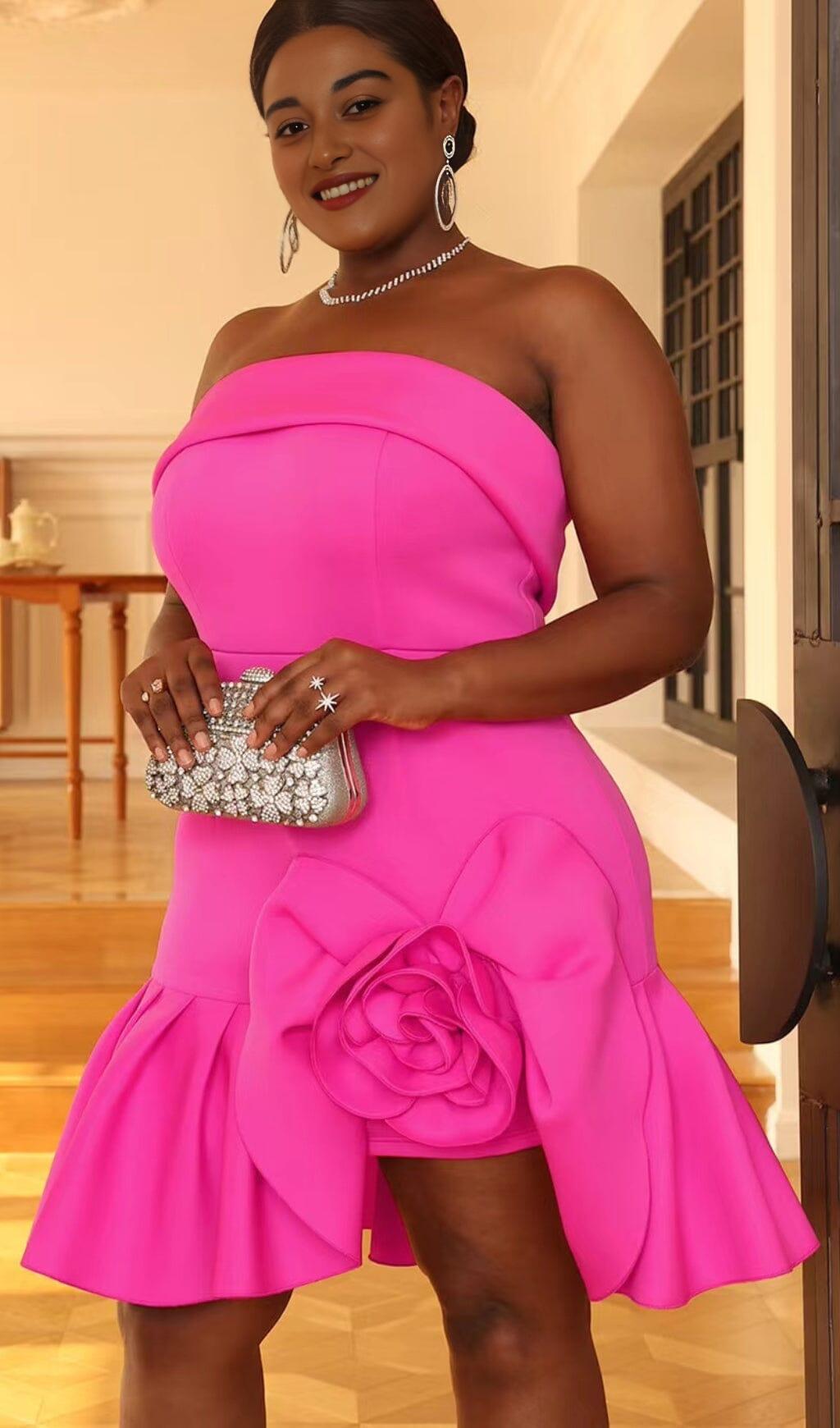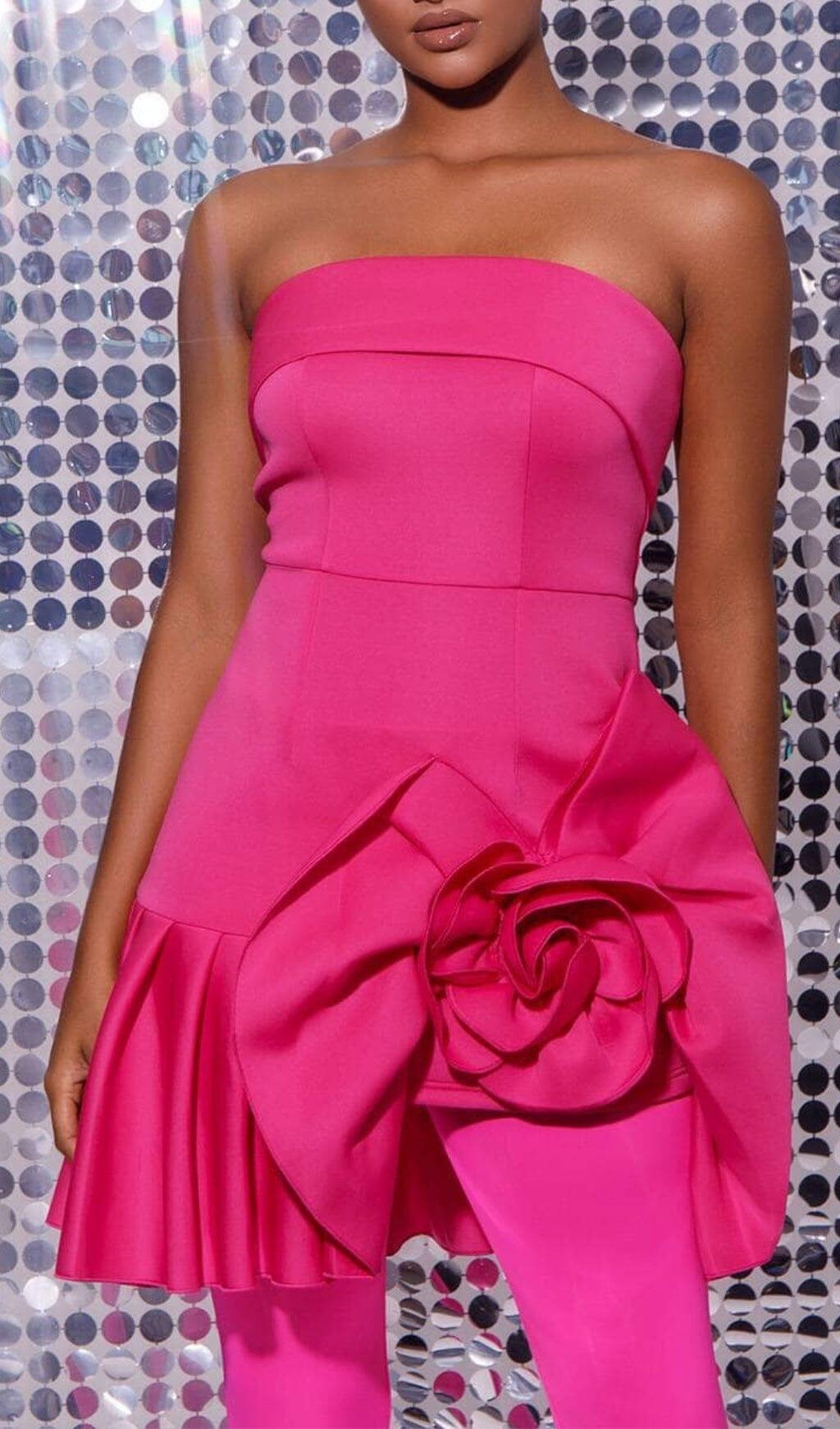 STRAPLESS FLOWER RUCHED MINI DRESS IN HOT PINK
