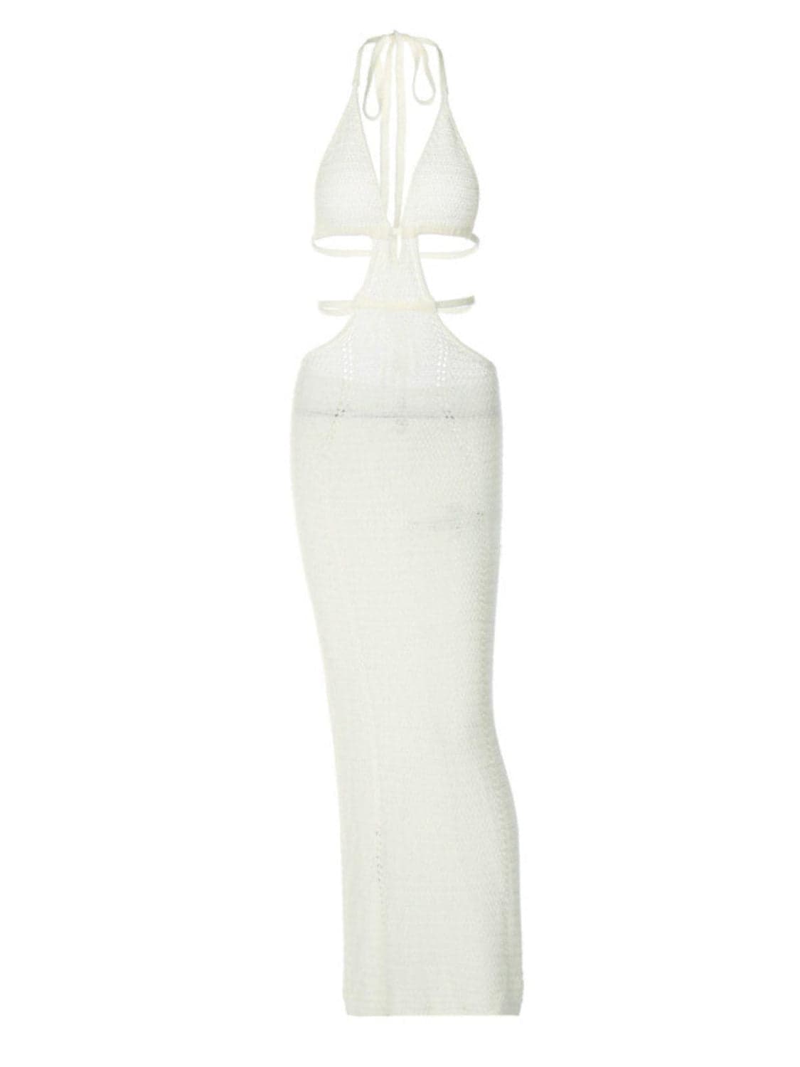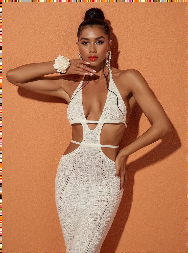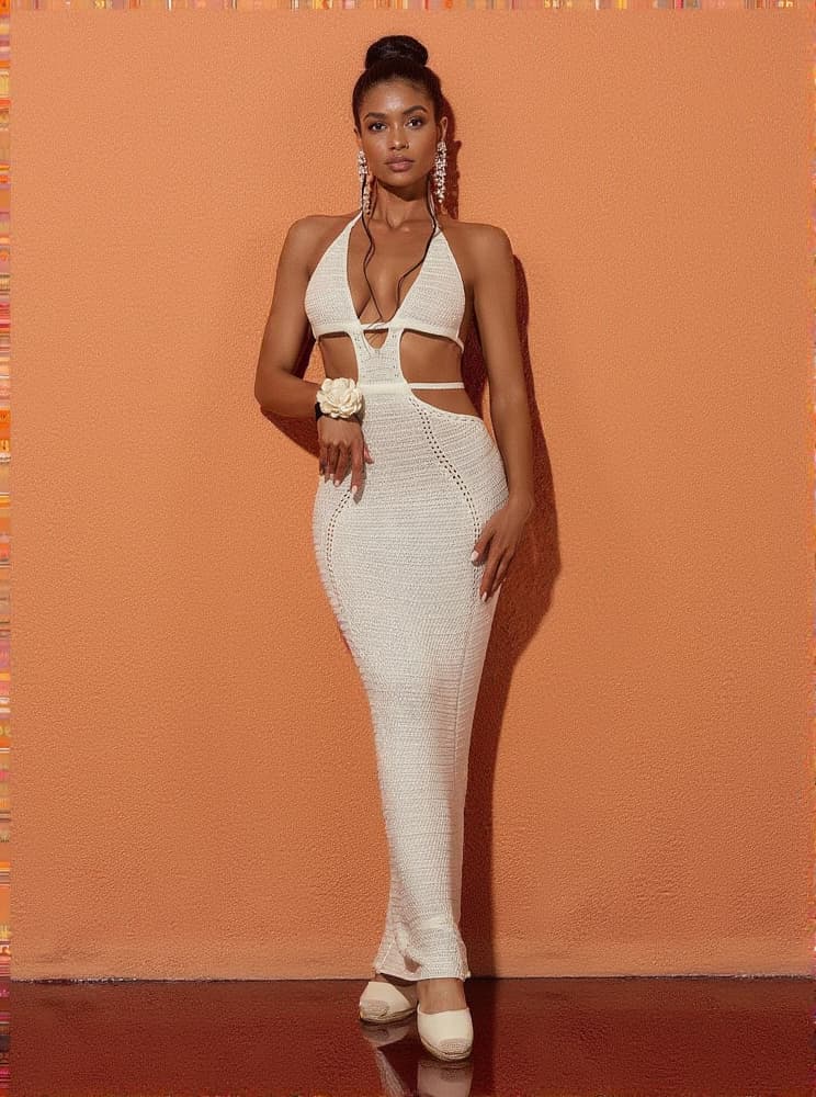 This Rosalinda Halterneck Knit Maxi Dress In White is perfect for any vacation. Featuring a halterneck, plunge, and backless design, it is made from soft, breathable knit fabric with a maxi length and cutout detail. Enjoy the perfect combination of comfort and style!