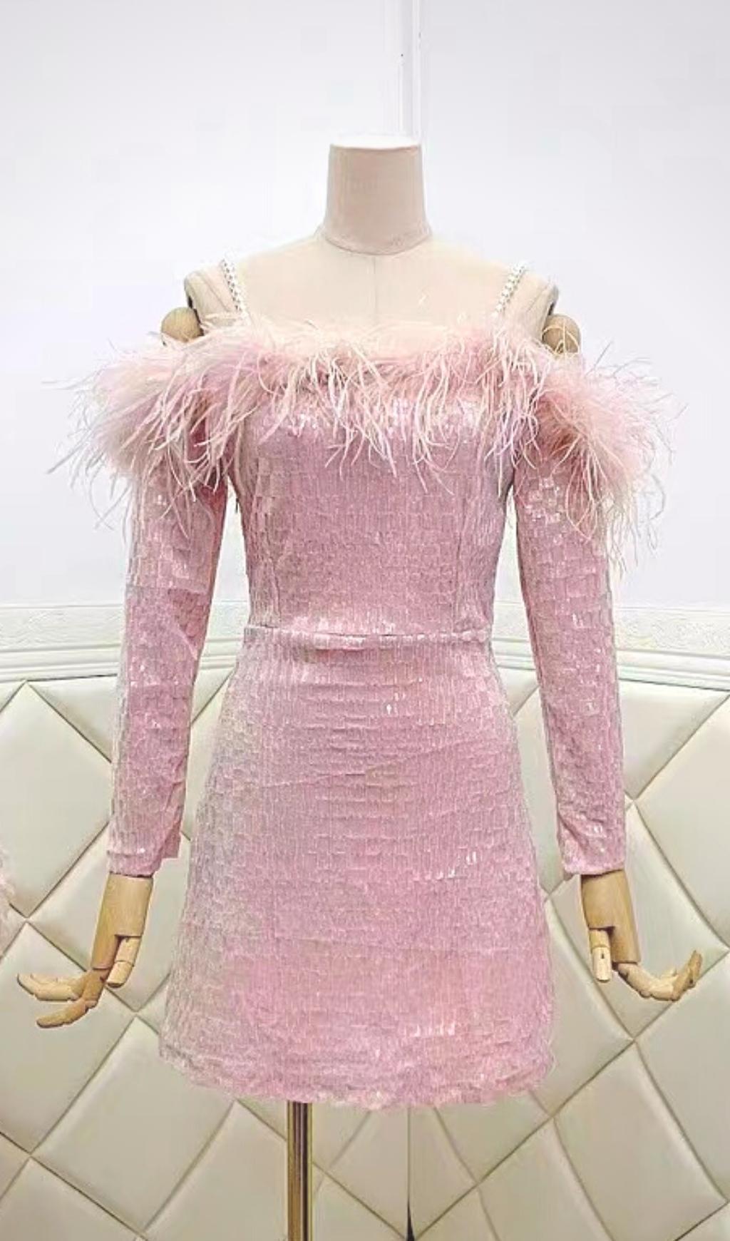 OFF SHOULDER FEATHER MINI DRESS IN PINK