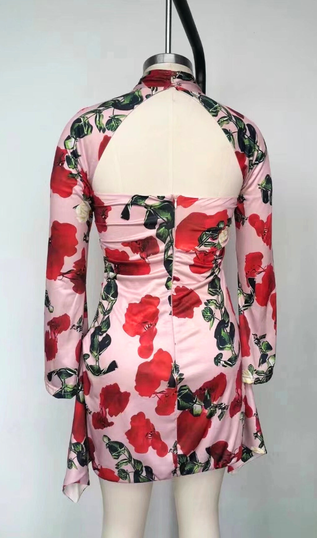 ROSE PRINT CUTOUT DRAPED MINI DRESS