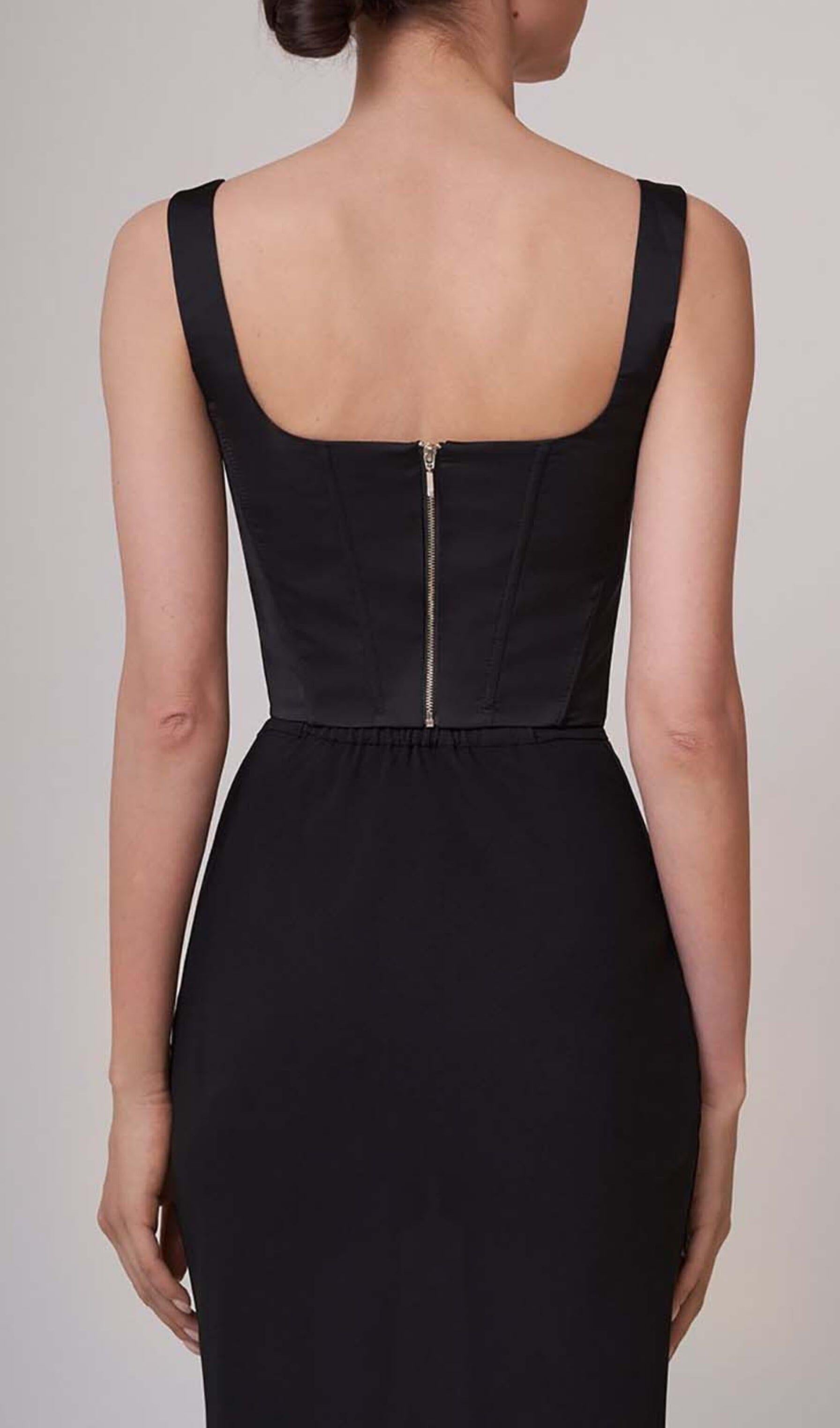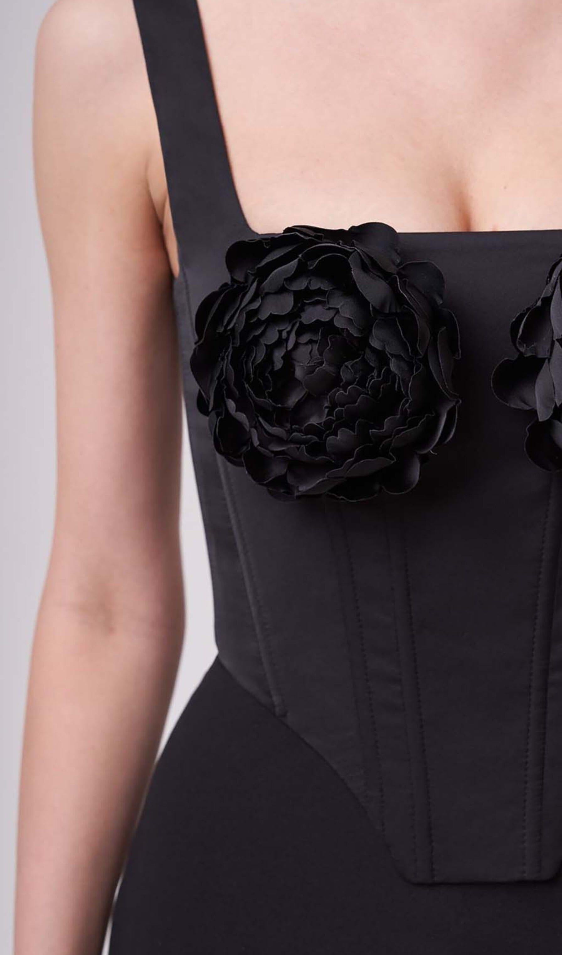 Elevate your style with our Roses Embellished Corset Two Pieces Set. This dangerously romantic ensemble combines a corset bodice adorned with beautifully embroidered black roses, off-the-shoulder straps, and a figure-hugging pencil skirt. With its sweetheart neckline and midi length, this dress is designed to highlight your décolletage and elongate your silhouette, giving you an irresistible allure.