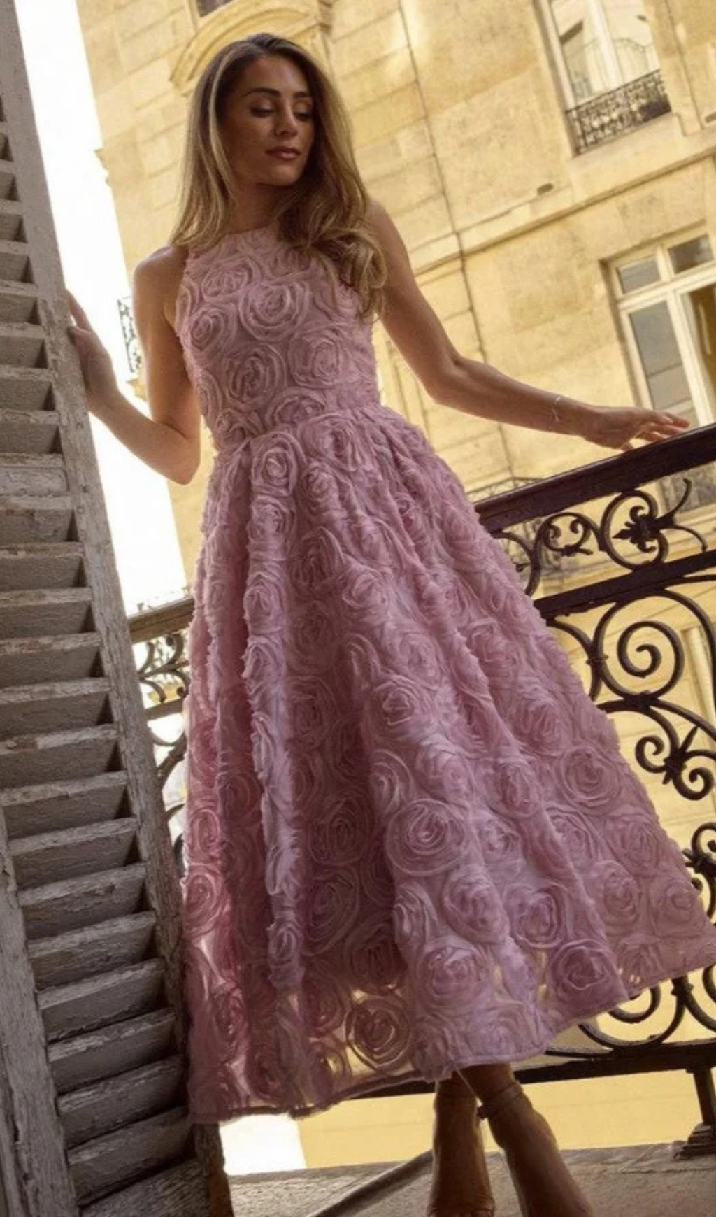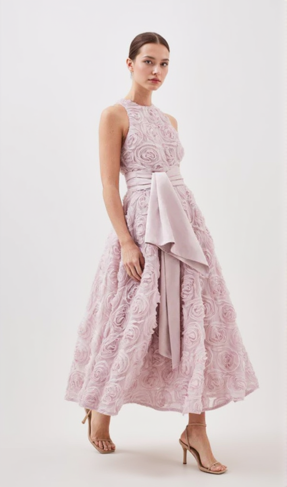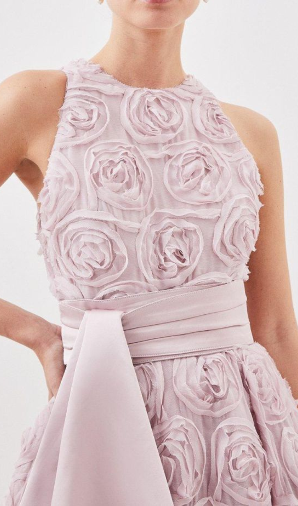 ROSETTE TULLE SATIN WOVEN BELT MIDI DRESS IN PINK