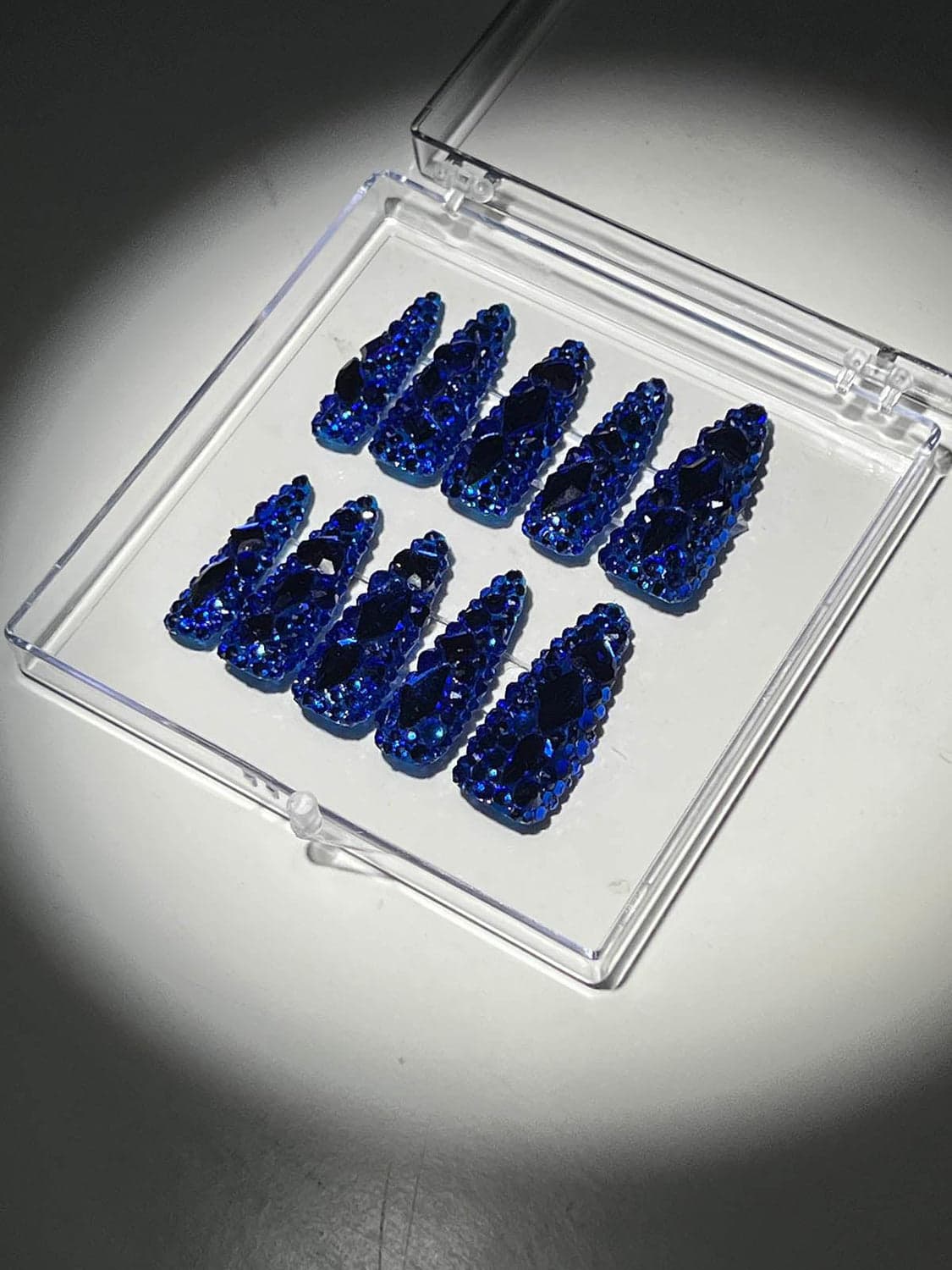 Royal Blue Crystal Stilleto Handmade Press On Nails—flashy and fabulous without the hassle! Put on your party nails in a flash and dazzle any room you enter. These press-ons will have everyone asking, "Who does your nails?" (our little secret).