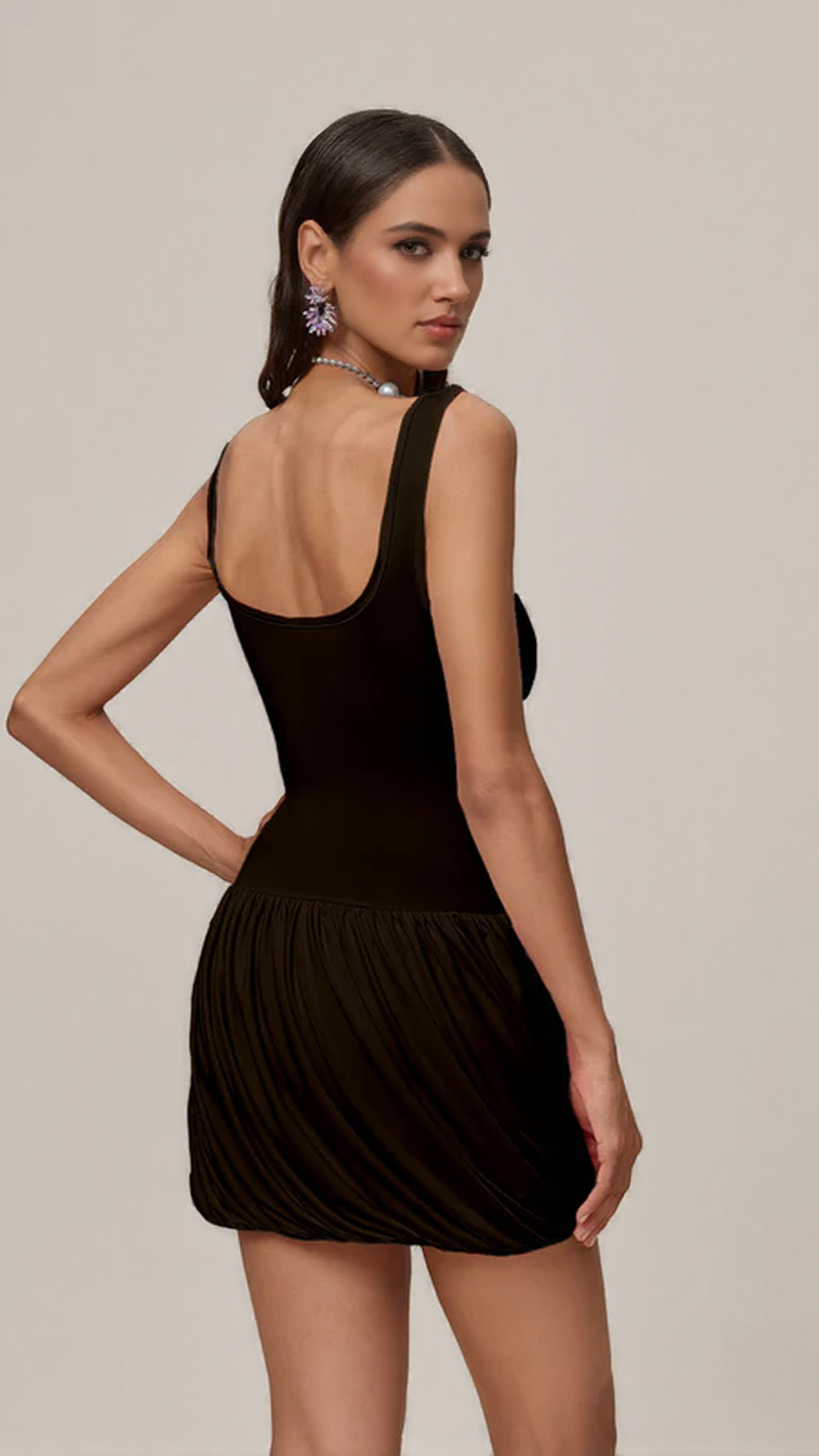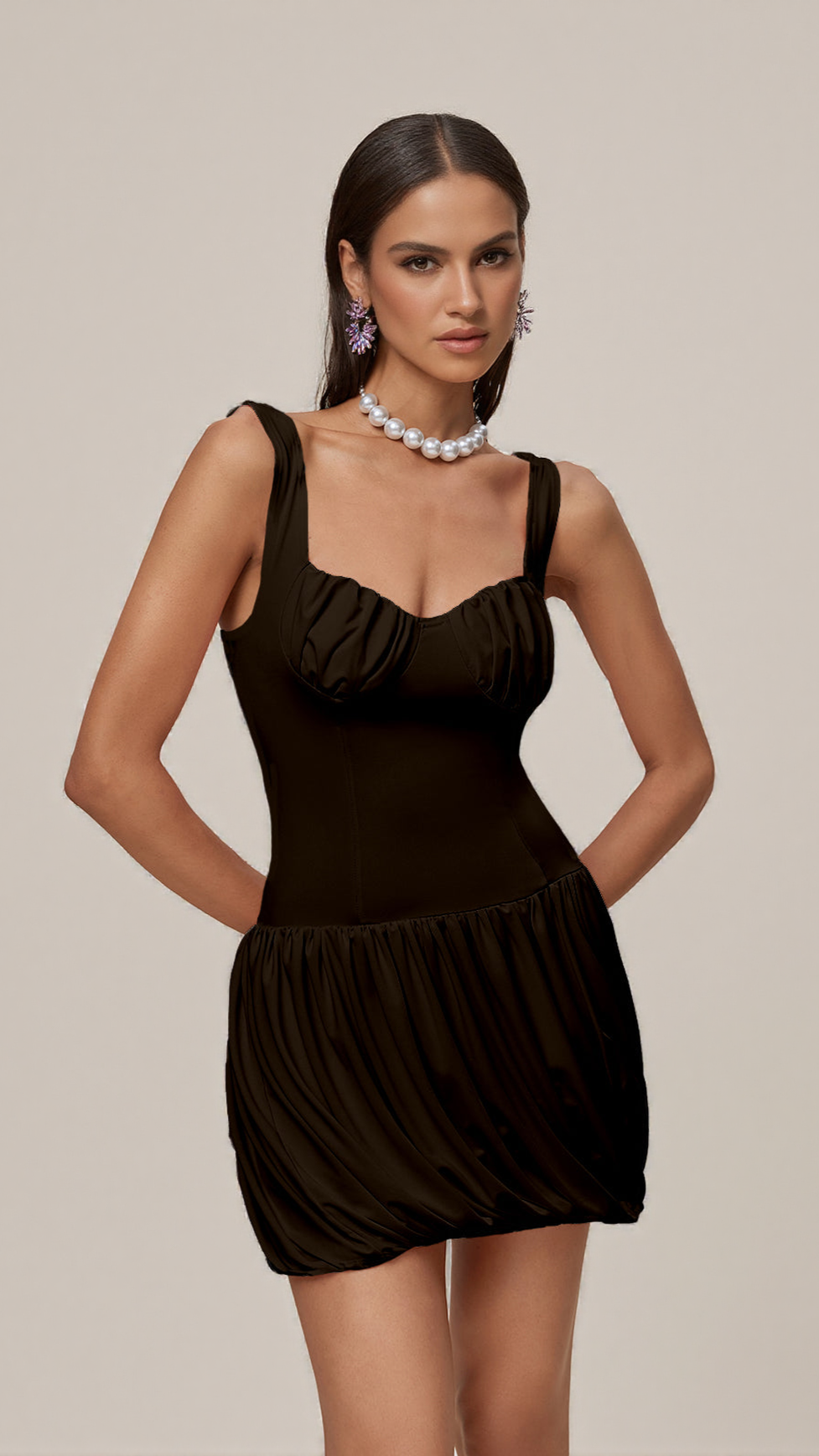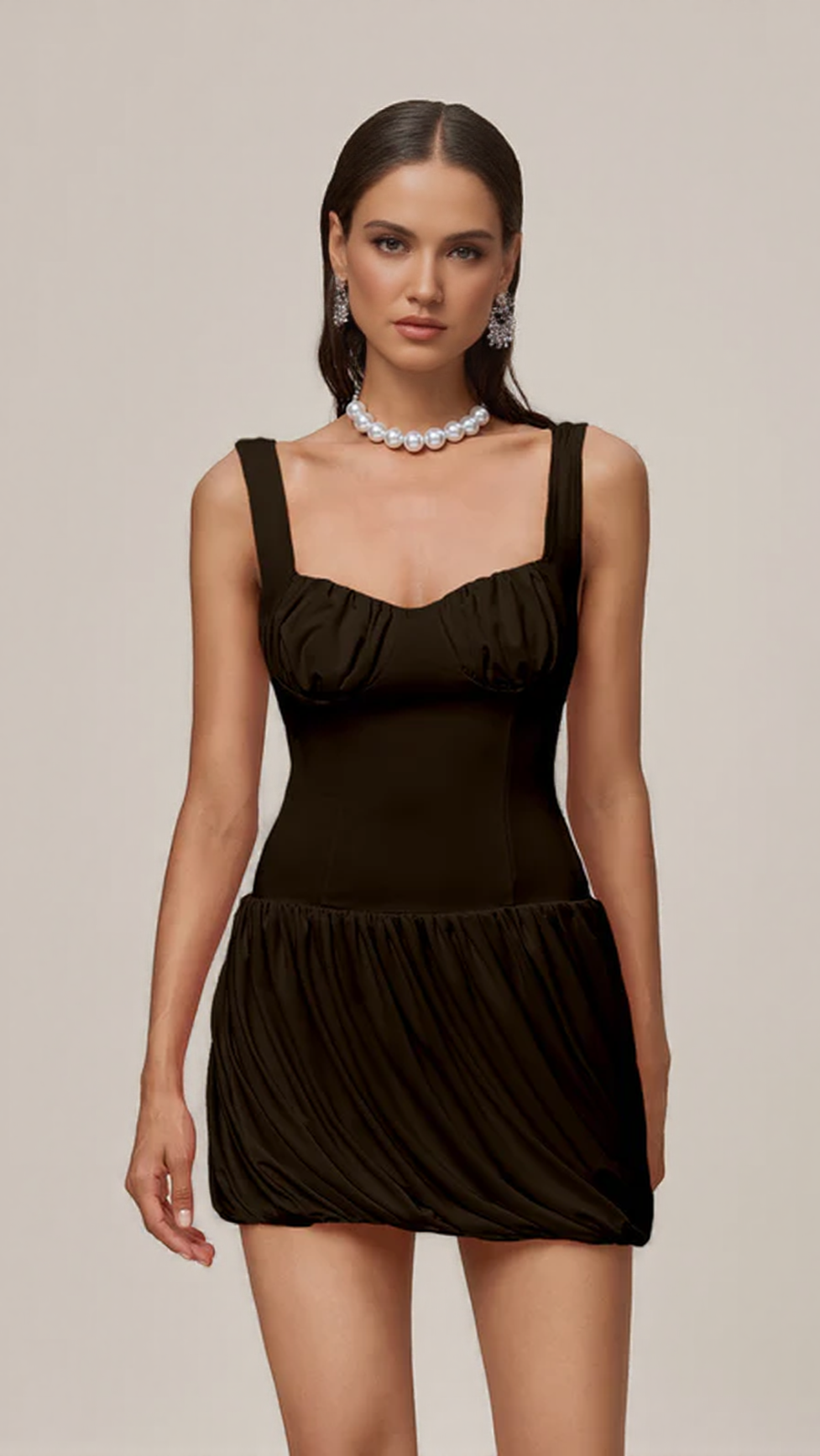 RUCHED BUBBLE MINI DRESS IN COFFEE