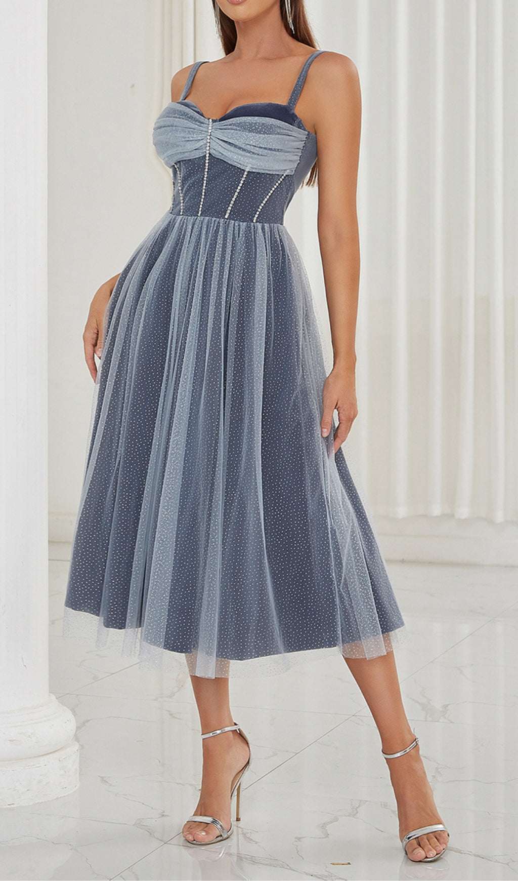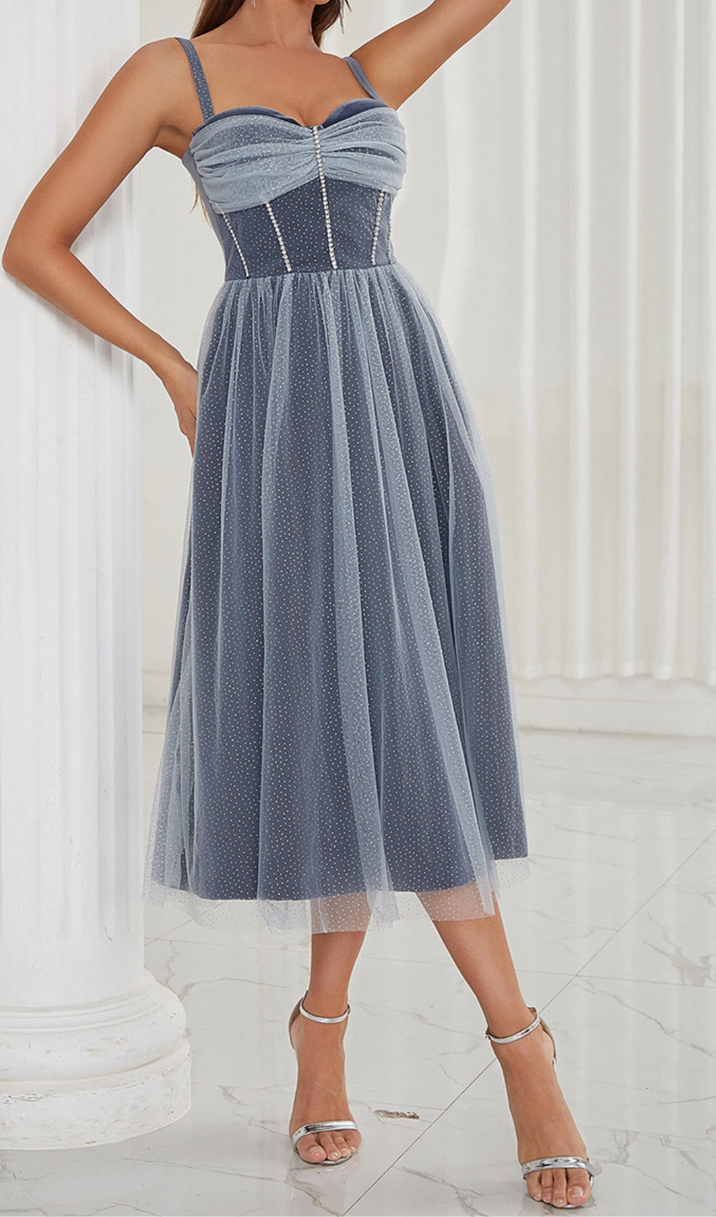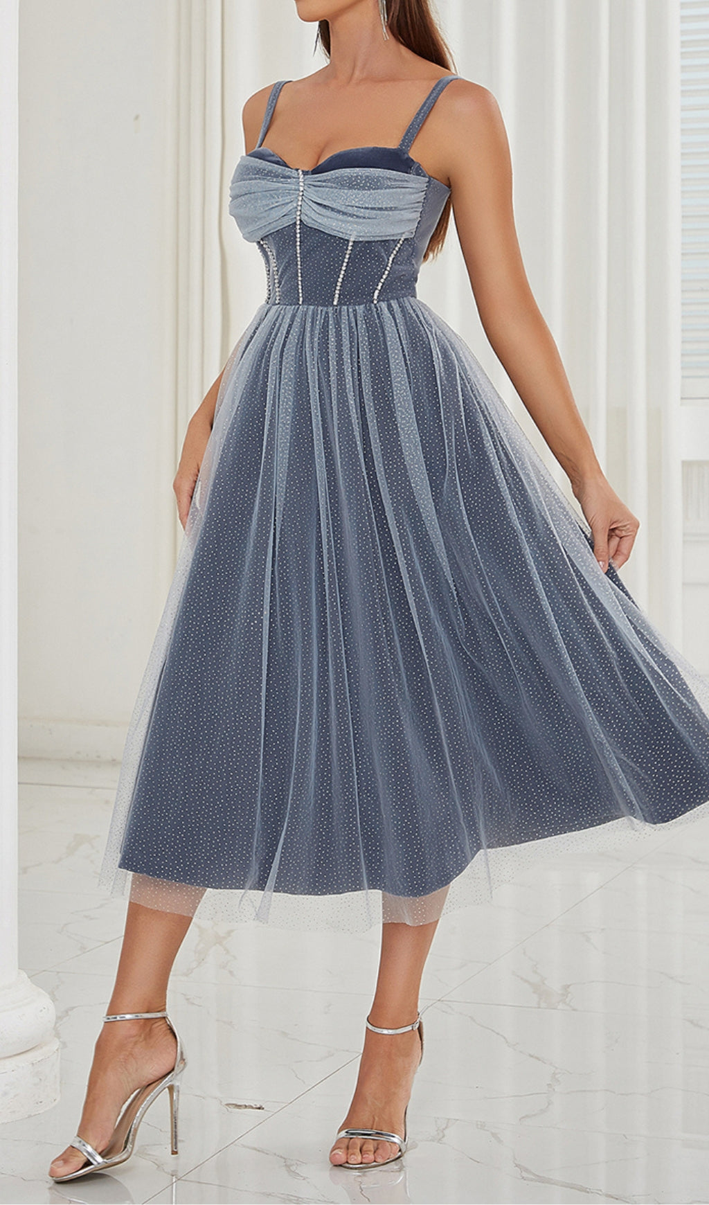 RUCHED BUST RHINESTONE MESH CAMI DRESS