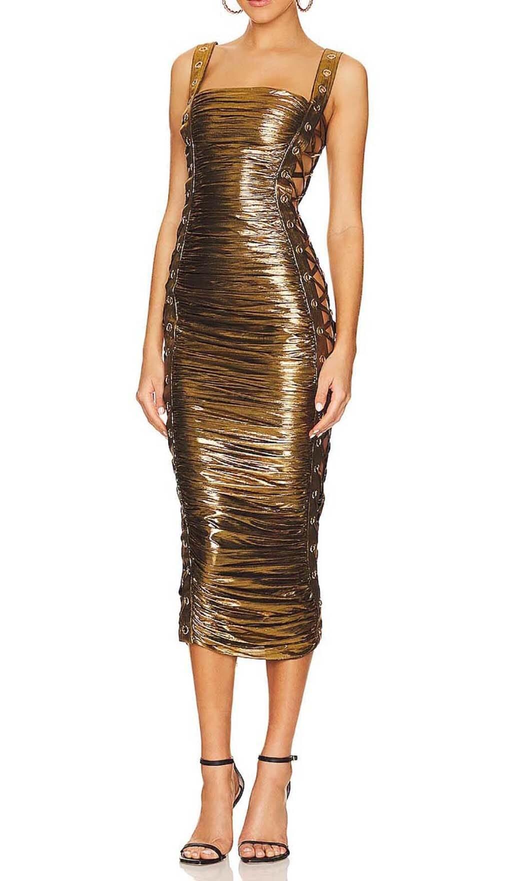 RUCHED METALLIC MIDI DRESS IN GOLD