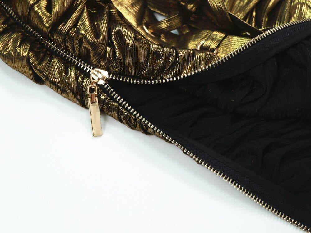Steal the spotlight in the Ruched Metallic Midi Dress in Gold, created exclusively for CB. This stunning dress is designed to make you feel like a goddess at any special occasion. With its liquid-shine gold fabric, it drapes and gathers across your curves, creating a flattering and glamorous silhouette.