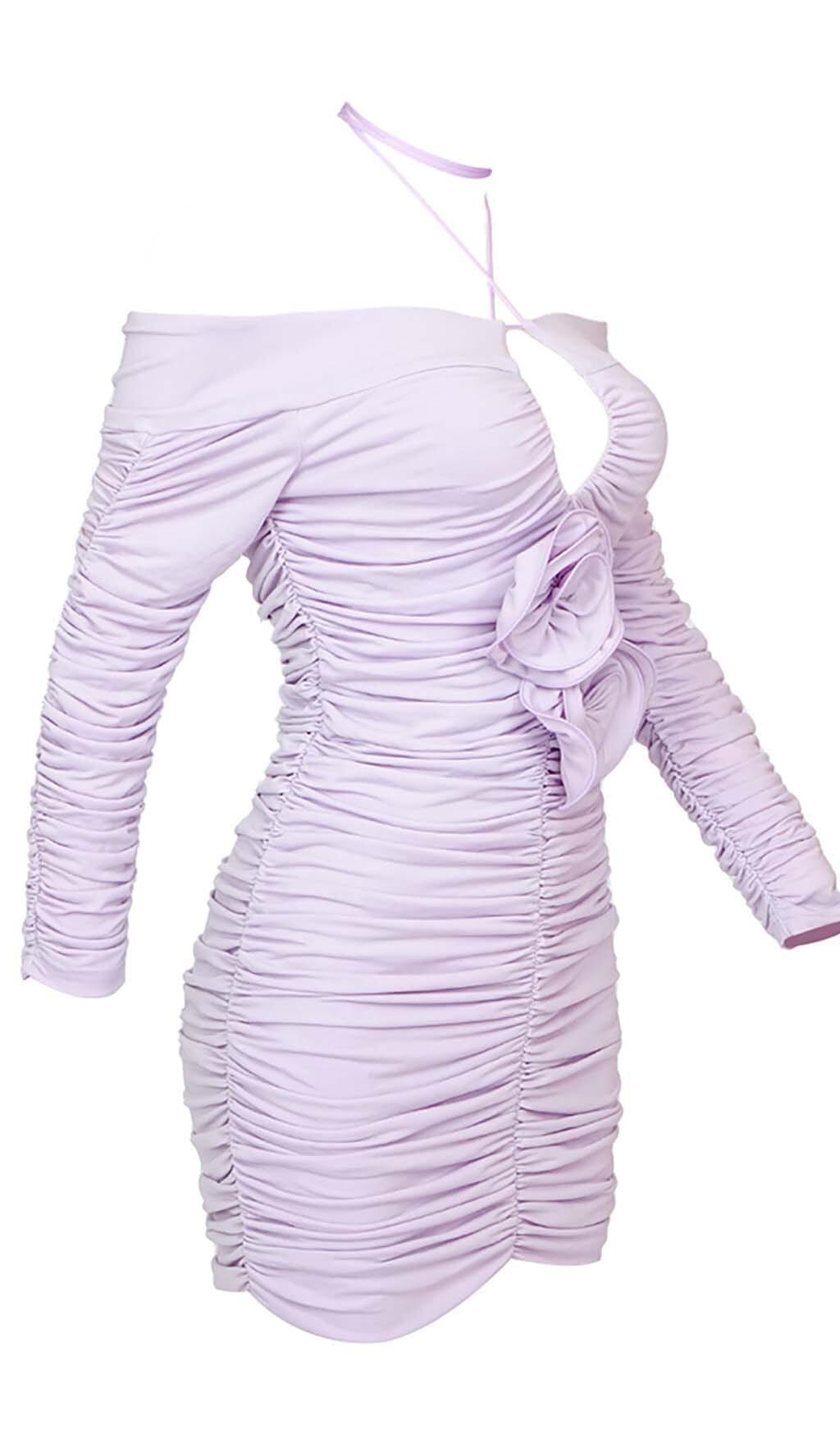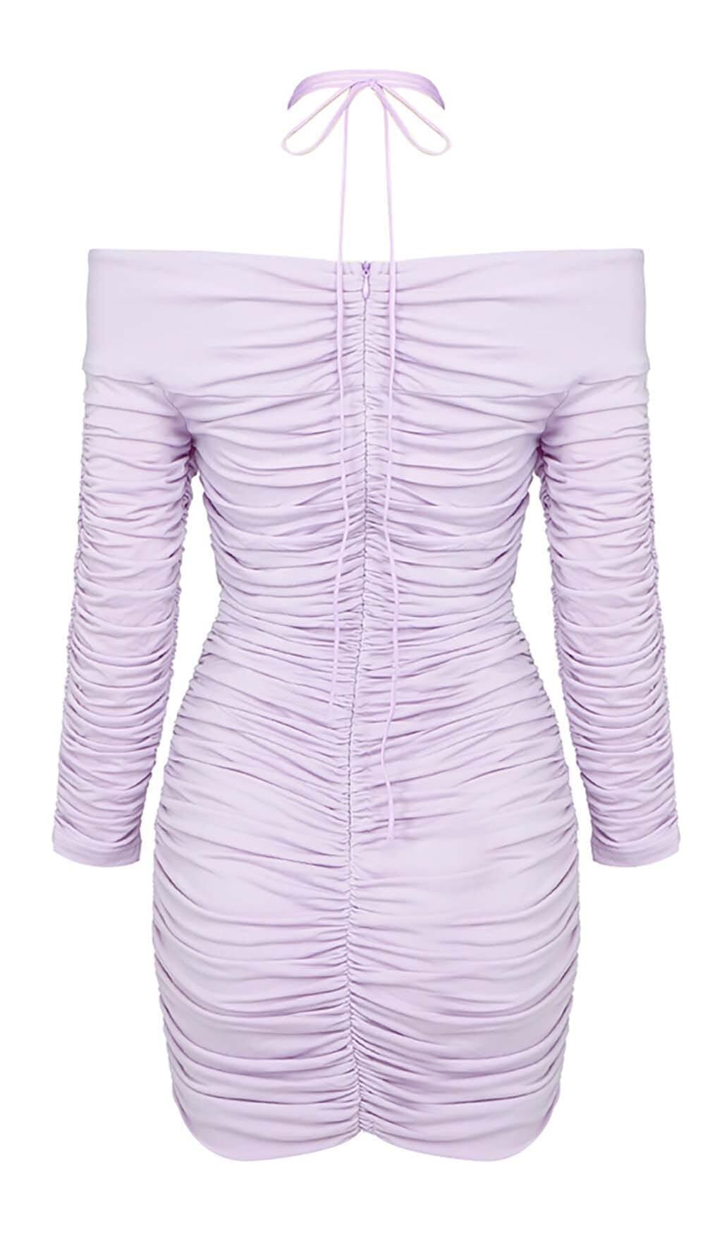 Flaunt your shoulders in this ruched off-shoulder mini dress in a rich lilac hue. Designed to accentuate your assets with figure-flattering ruching and a bodycon fit. The short hemline shows off legs for days. Complete the look with strappy heels for night out allure.