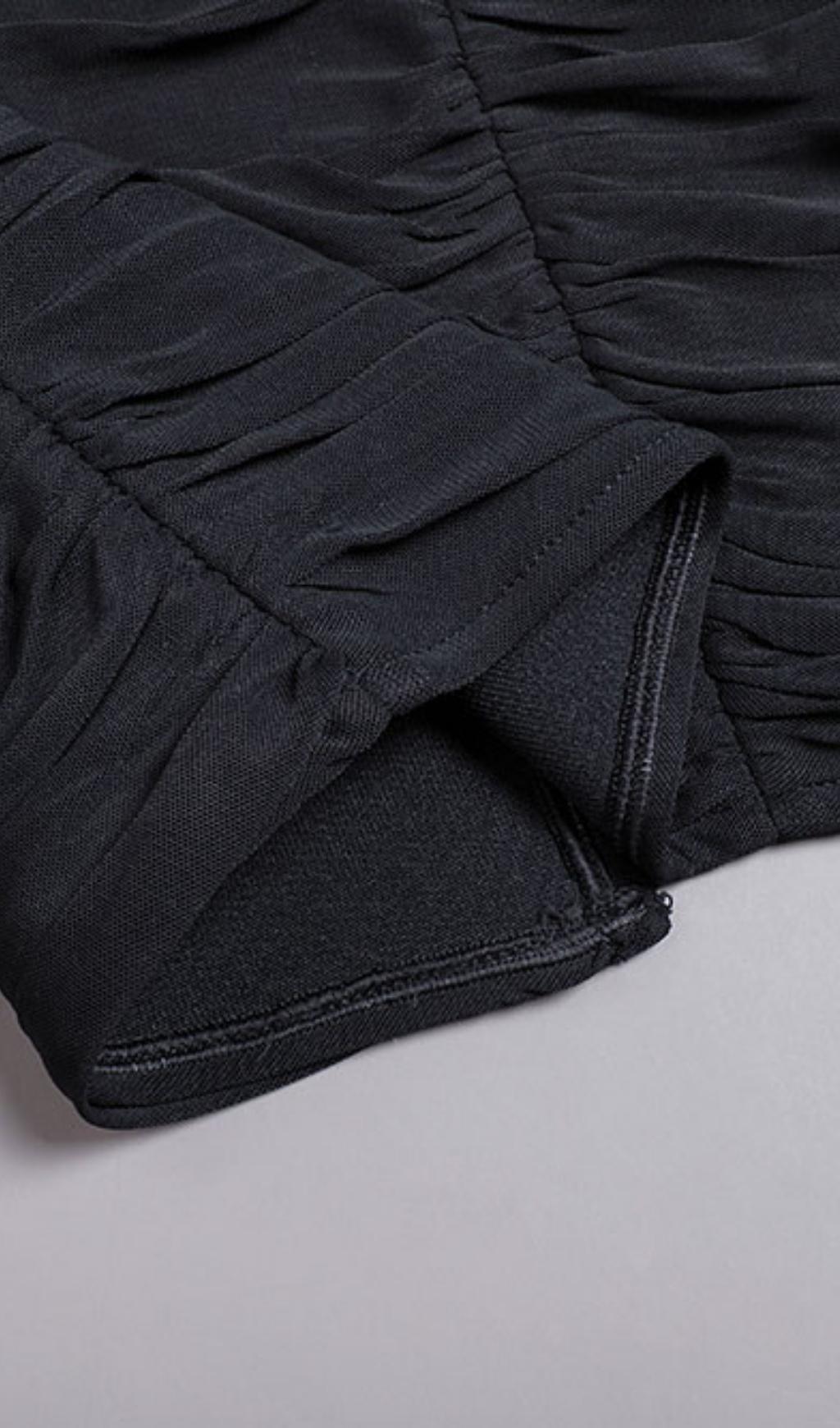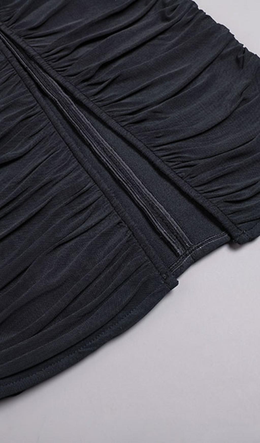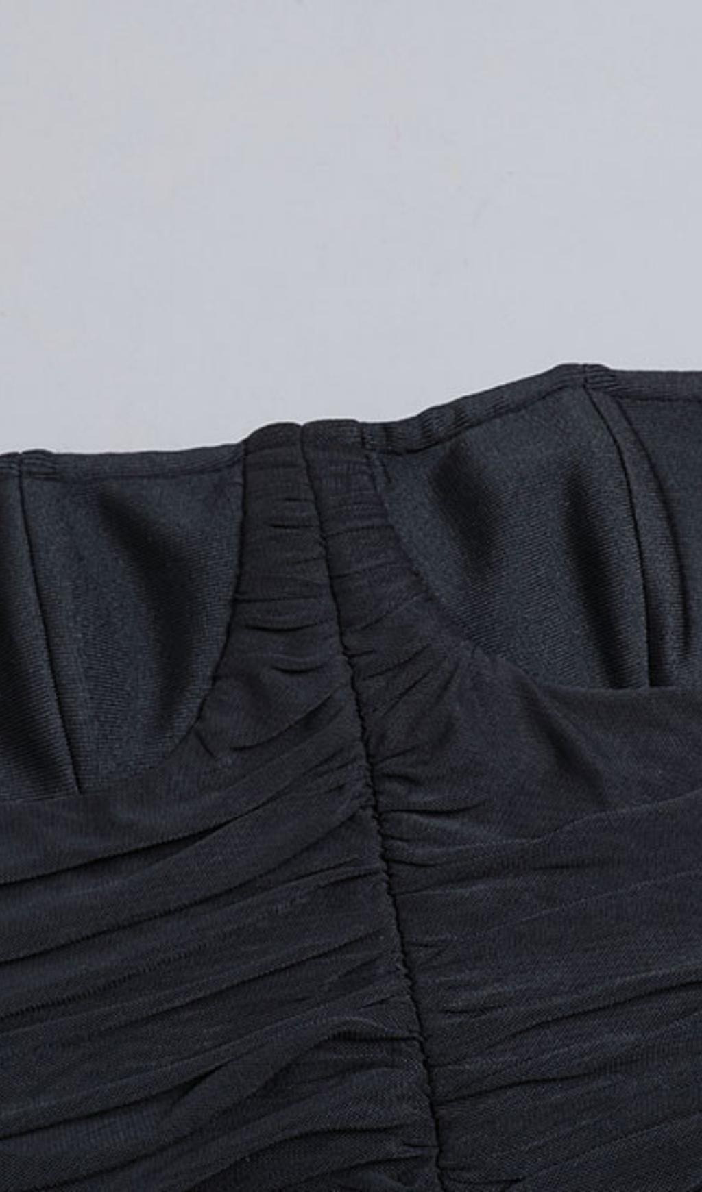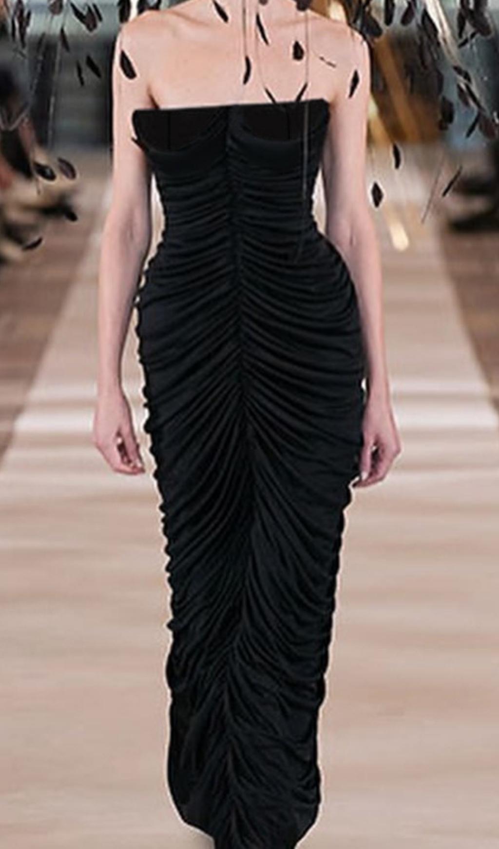 RUCHED STRAPLESS MIDI DRESS IN BLACK