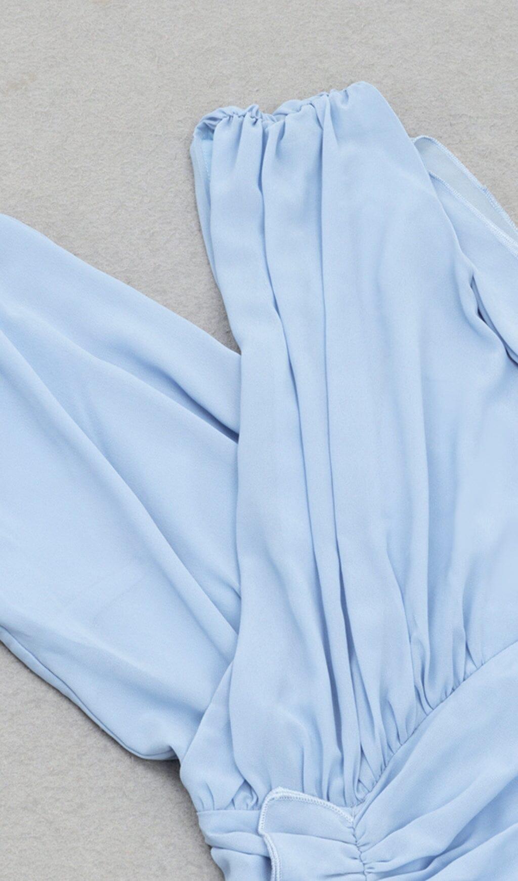 RUFFLE V-NECK MIDI DRESS IN TRANQUIL OCEAN