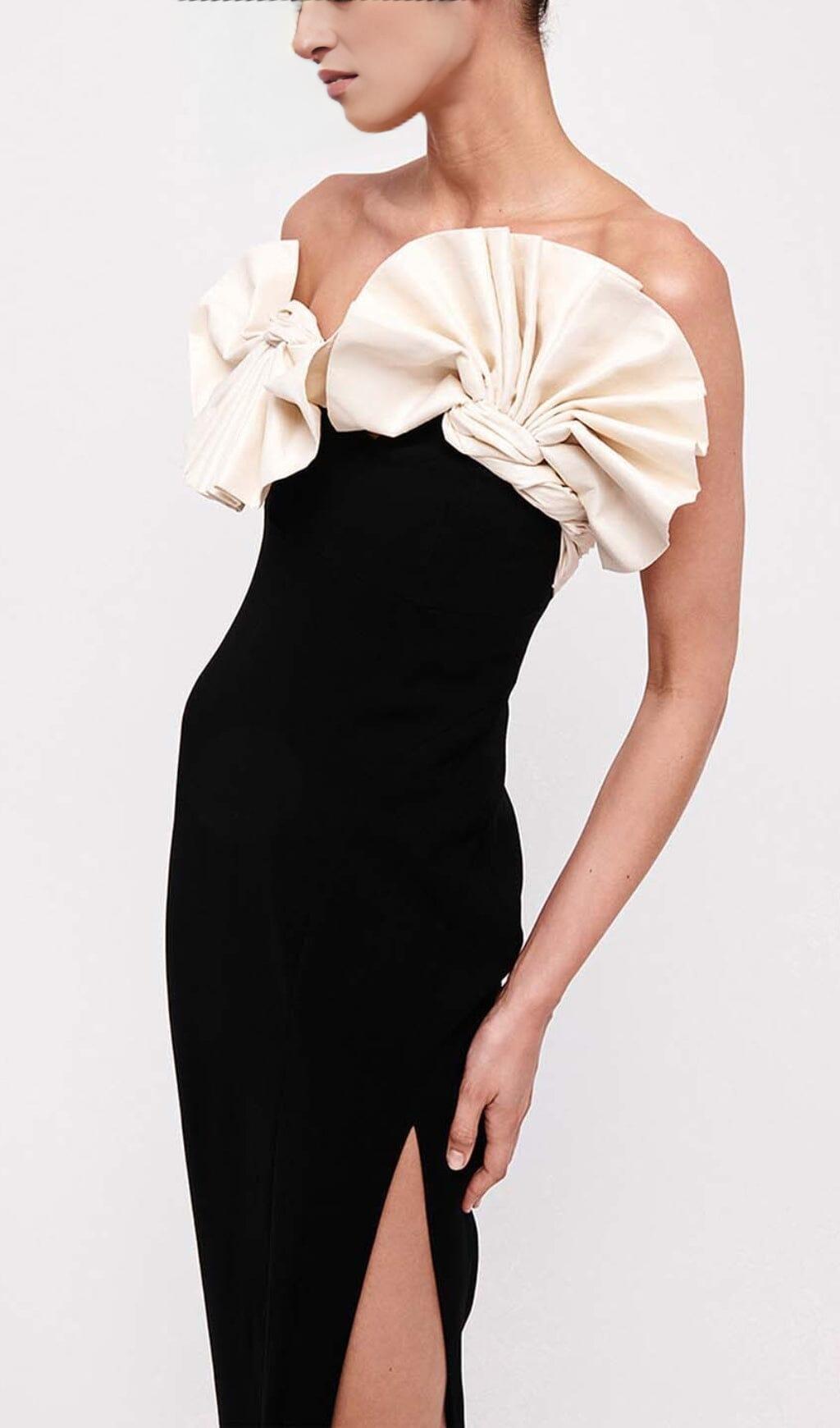 RUFFLED DETAILING SLIT MIDI DRESS IN BLACK