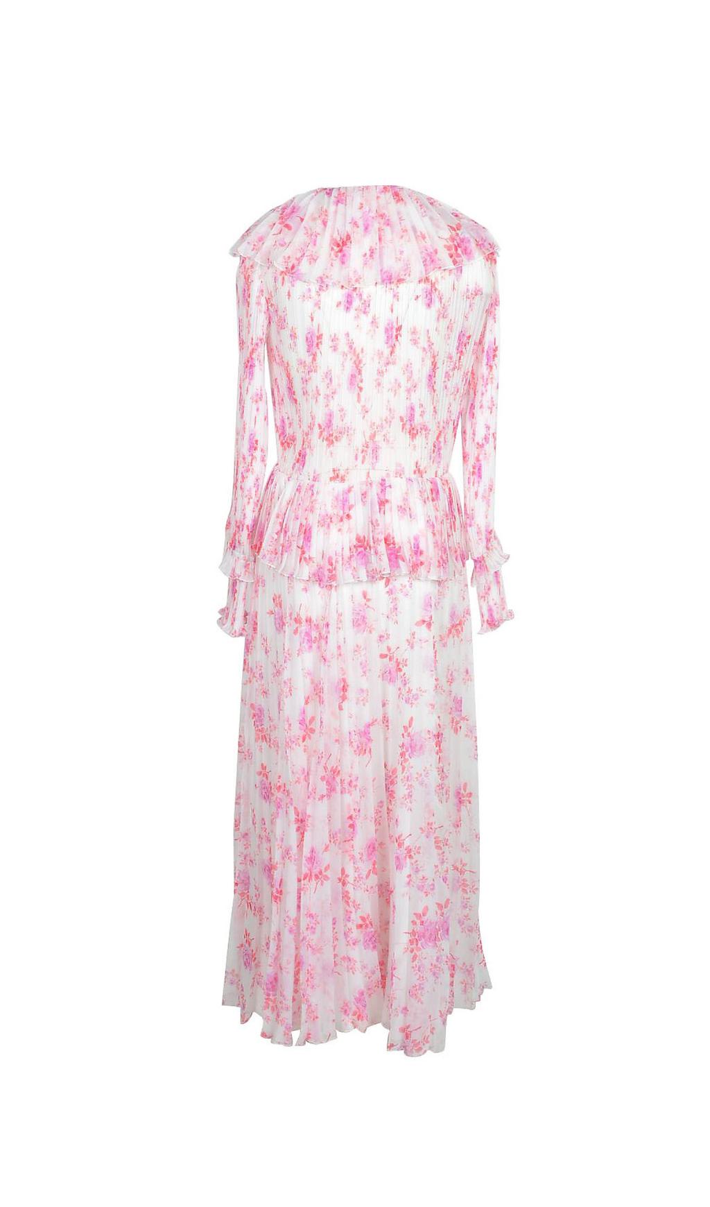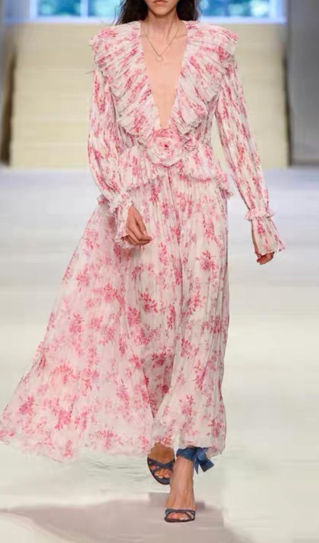 RUFFLED FLORAL-PRINT PLISSÉ-CHIFFON MAXI DRESS