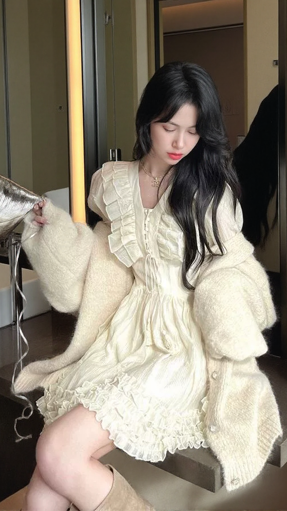 RUFFLED LONG-SLEEVE MINI DRESS IN CHAMPAGNE